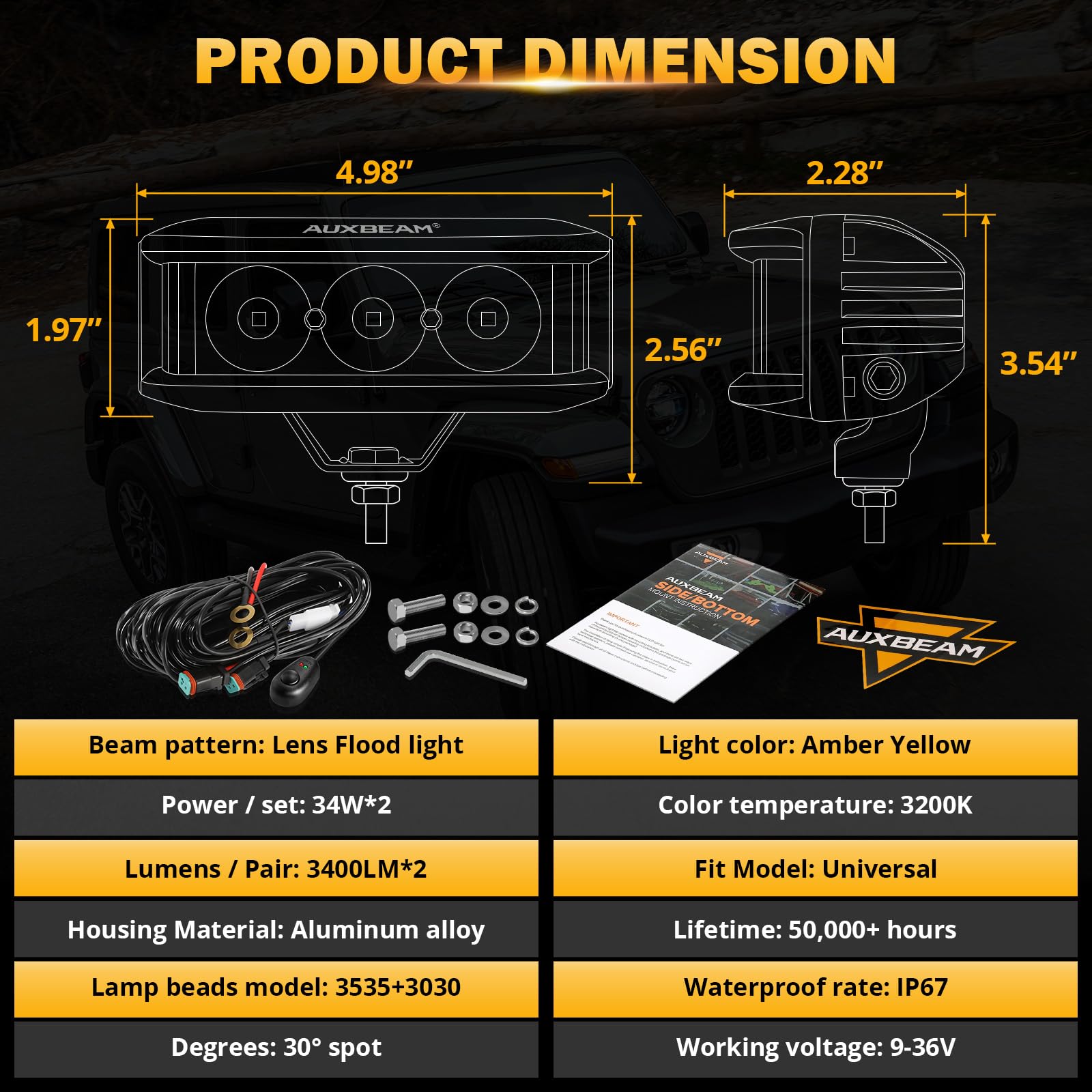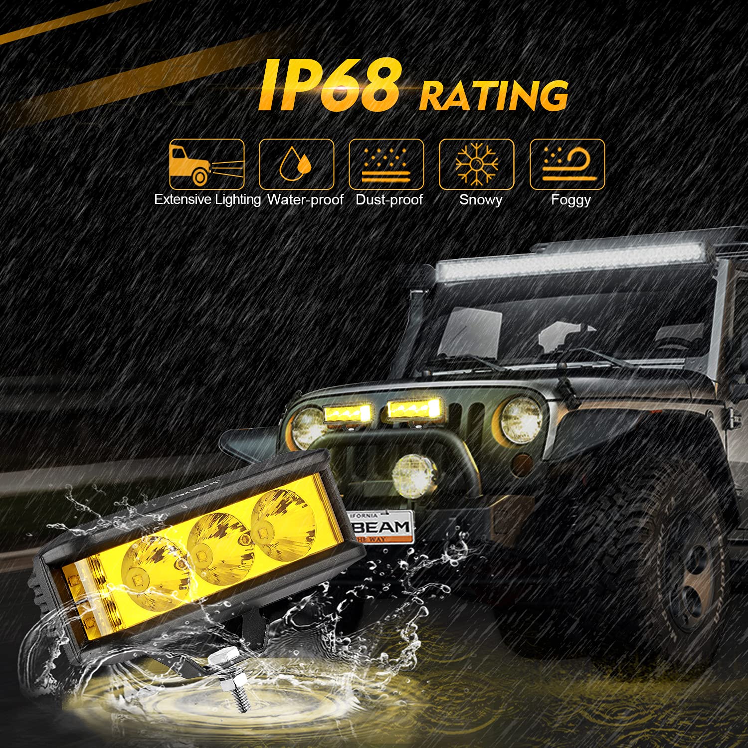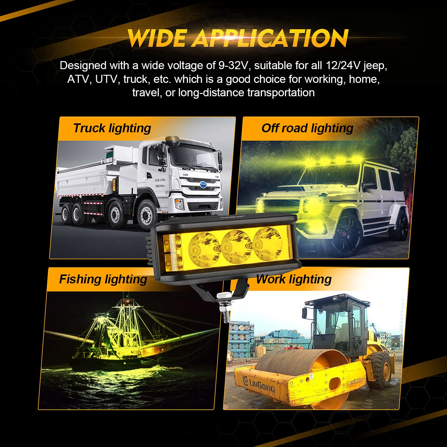 -【SMALL & SUPER BRIGHT】These LED pod only 5", each load with 3 pcs high-Intensity LEDs, provide 3200K bright cool yellow spot light, 68W 6800LM output. Spot flood combo beam for widespread and long distance illumination