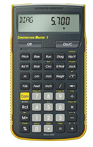 Amazon.com An essential tool for serious building professionals(view larger). Ideal for contractors, builders, architects, engineers, and other serious building professionals, the Construction Master 5 Construction Calculator (model 4050) from Calculated Industries helps you get fast, accurate construction-math calculations in the office or on the job site. Reduce the risk of expensive errors when estimating costs and materials. Enter the numbers--just as you would say them--and the solutions appear in an instant.The Construction Master 5 works in and converts between building dimensional formats: yards, feet-inch-fractions, decimal feet-inches and metric--including area and volume. A custom rafter function provides common rafters, regular and irregular hips, valleys and jacks, while a rake-wall function determines stud length for any on-center spacing, in ascending or descending order. Other dedicated functions include stair calculations for risers, treads, stringer length, and incline angle; solutions for circles, arcs, columns, pillars, windows, post-holes, and more; and board feet lumber estimations.Other features include solving for cost per unit, a "paperless" tape that lets you review the previous 20 entries to double-check your totals, ability to store preferred fractional values and dimensions, and work with standard calculations.It's powered by a single CR2016 battery (included), and the Construction Master 5 has an auto shut-off feature that turns the calculator off after about 8 to 12 minutes of non-use. The calculator measures 2.95 x 5.7 x 0.67 inches, weighs 4.5 ounces, and comes with a hard protective cover with a pocket reference guide. It's backed by a one-year limited warranty.What's in the BoxCalculated Industries 4050 Construction Master 5 construction calculator; protective slide cover; quick reference guide; pocket reference guide; battery4050 Construction Master 5 Construction CalculatorAt a Glance:Essential tool for building professionalsWork in and convert between dimensions, area, and volume--including metricComplete rafter, roof, and framing solutionsBuilt-in right-angle calculations with automatic square-upsPowered by single CR2016 batteryOne-year limited warranty From the Manufacturer The Construction Master 5 is fun to use. Quickly find solutions to building and dimensional problems that seem to come-up and you haven't used the math formulas for years. Enter the numbers, just as you would say them, and the solutions appear in an instant they're built-in to your Construction Master 5. Reduce the risk of expensive errors when estimating dimensions, costs and materials. Save time, money and frustration!