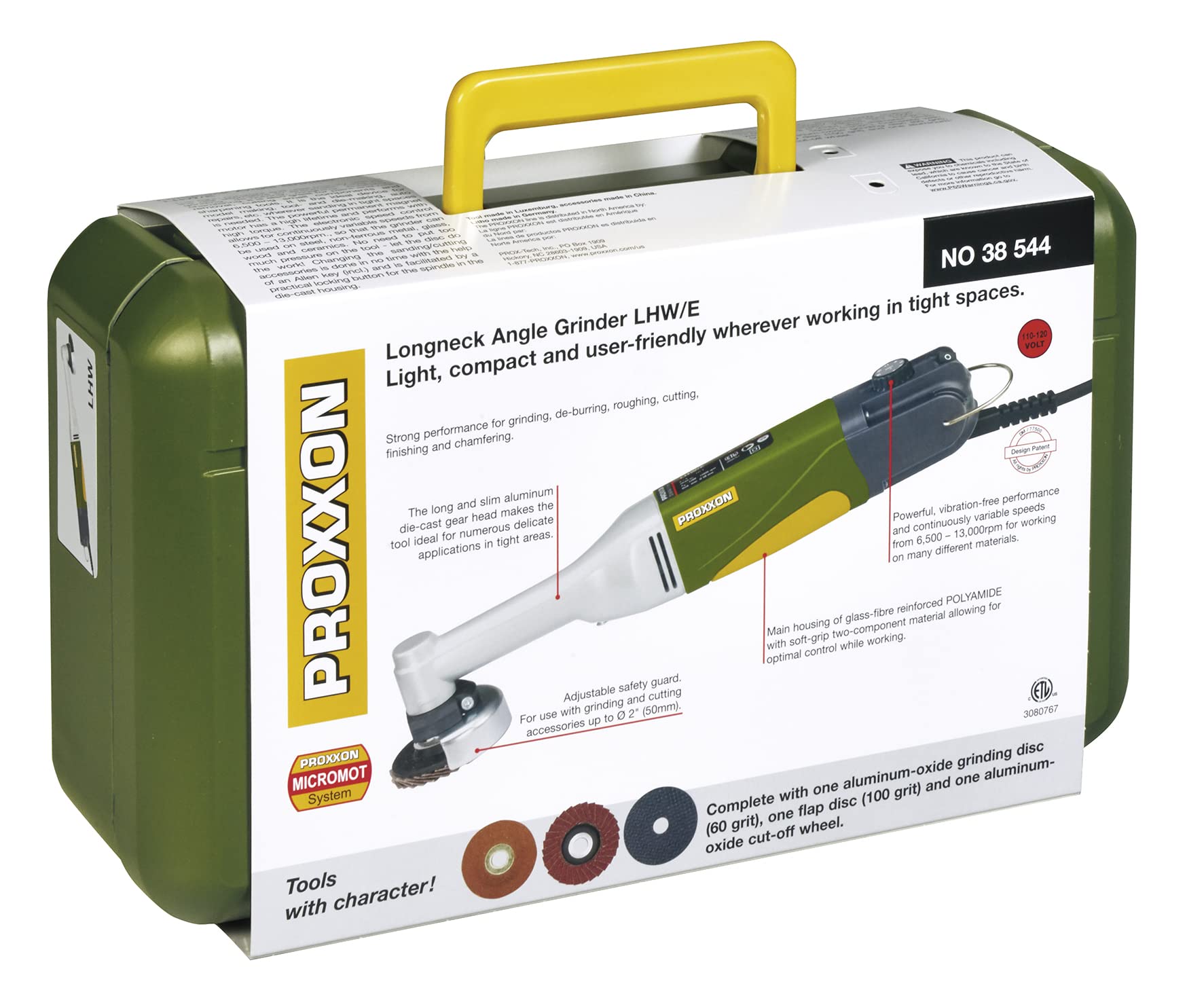 Product Description This light, compact and user-friendly unit is the real alternative to pneumatic tools for grinding, deburring, roughing, finishing – wherever working in tight spaces. It is also great for paint and rust removal, cutting small components and sharpening tools. The powerful permanent magnet motor has a high lifetime and performs with high torque. Complete with one aluminum-oxide grinding disc (60 grit), one flap disc (100 grit) and one aluminum-oxide cut-off wheel. Technical data: Volts 110 - 120V AC, 60Hz. Max. Power 1/8hp (100W). Speed 3,300 - 13,000rpm. Length 11 13/32" (290mm). Weight 1.2 lb (550g). Disc diameter 2" (50mm), bore: 13/32" (10mm). From the Manufacturer Proxxon Longneck Angle Grinder LW/E is light, compact and user friendly. Unit is the real alternative to pneumatic tools for grinding, deburring, roughing, finishing - wherever working in tight spaces is needed. It is also great for paint and rust removal, cutting small components and sharpening tools. The powerful permanent magnet motor has a long lifetime and performs with high torque. Replacement Discs: Flap Disc 28590 (100 grit), 28591 (150 grit); Aluminum Oxide Cutoff Wheel 28154; Aluminum Oxide Grinding Disc 28585 (60 grit), 28586 (36 grit); Silicon Carbide Grinding Disc 28587 (60 grit); Backing disc 28548; Corundum sanding disc 28549 (80 grit), 28550 (120 grit, 28551 (180 grit), 28552 (240 grit); Sanding Fleece 28554 medium, 28555 fine; Disc with tungsten carbide burrs 29050.