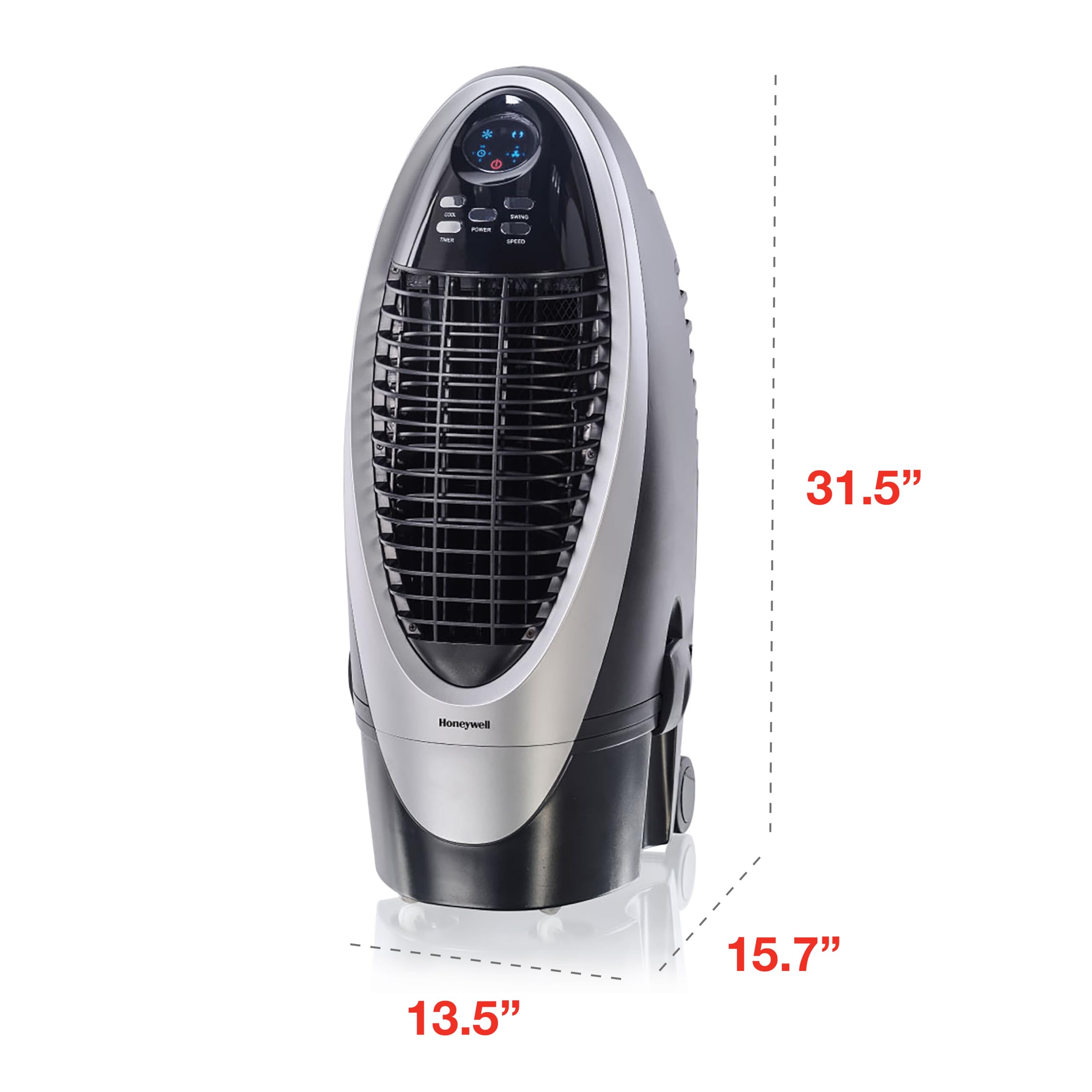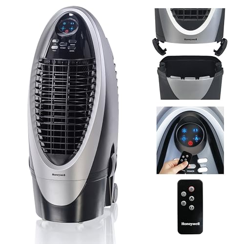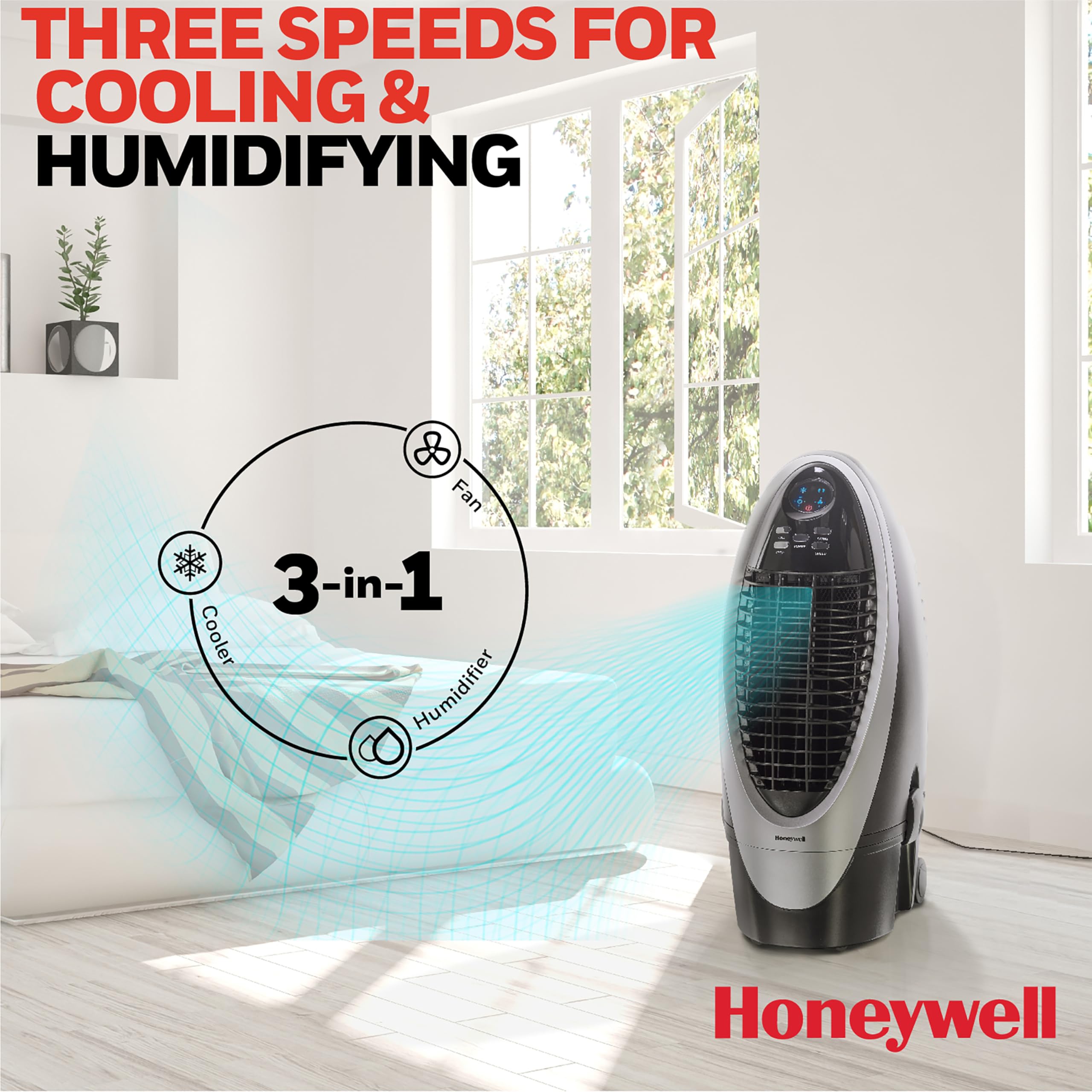Honeywell Enfriador evaporativo portátil para interiores, ventilador y humidificador, 300 CFM, con tanque desmontable, filtro de polvo de carbón y control remoto, plateado/gris