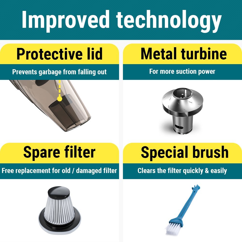 -Powerful: The cyclonic force and strong suction of the 106w motor will terminate any dirt or debris; say goodbye to hard-to-reach crumbs stuck under the driver’s seat. Our mini car vacuum even has a top of the line washable HEPA filter.