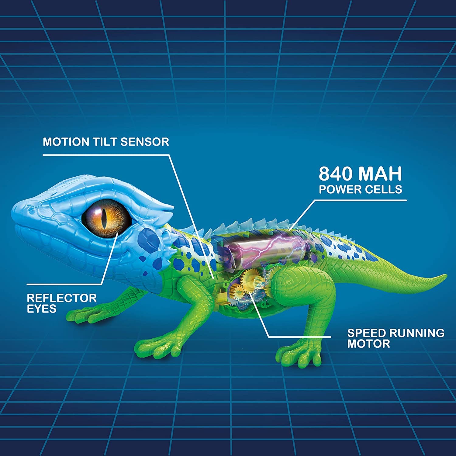 -Package includes: 1 x Robotic Lurking Lizard (Green + Blue), 1 x Instruction Manual. No batteries included