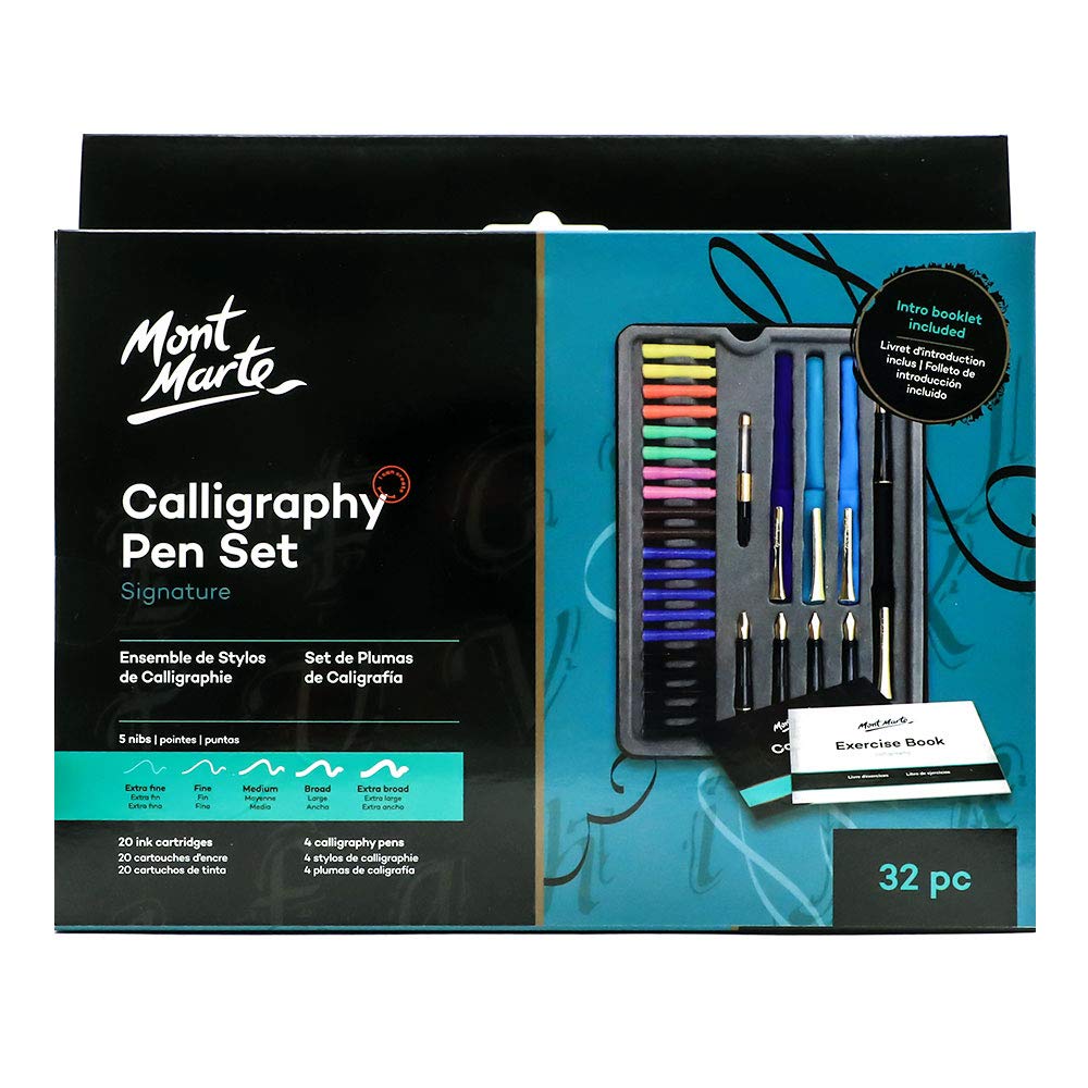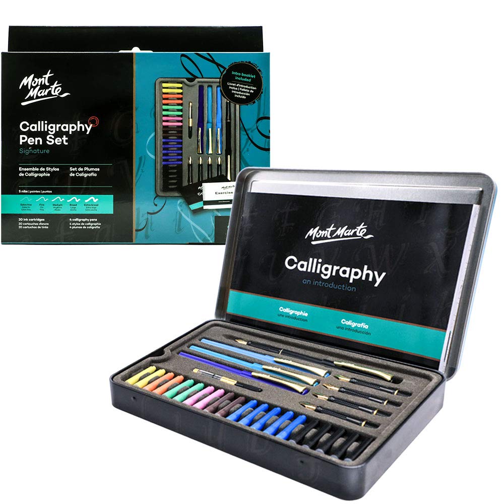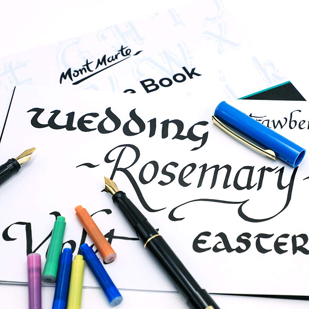 Juego de bolígrafos de caligrafía Mont Marte, paquete de 2, adecuado para principiantes y niños, incluye bolígrafos de caligrafía, puntas de caligrafía, cartuchos de tinta y cuaderno de ejercicios