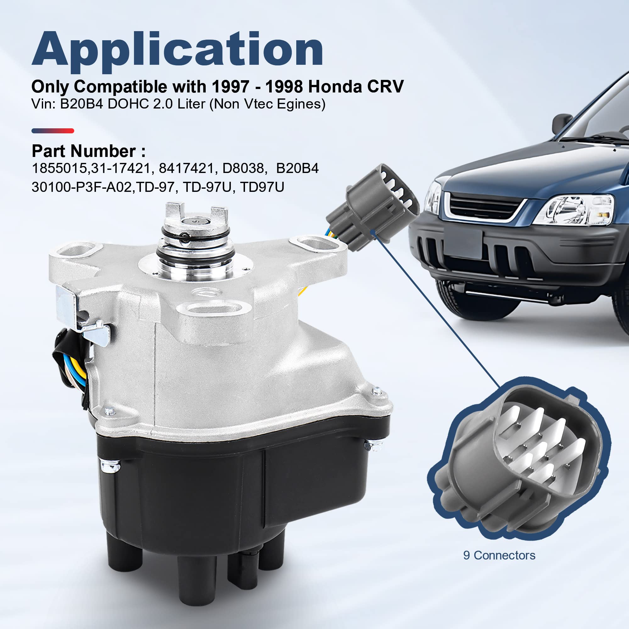 Adavanced and Completed Production and Test Machines to Insure Quality Products A distributor is a device in the ignition system of an internal combustion engine that routes high voltage from the ignition coil to the spark plugs in the correct firing order. This distributor includes everything needed for the assembly (Distributor, Cap, Rotor and Coil), replaces damaged or weakened OEM Distributors. Application ---Year-----Make---Model--Trim--Engine----Notes Compatible with 1997-98--Honda----CR-V----All----All ----JDM Engine Only Note Compatible with Honda CRV 1997 - 1998 Vin: B20B4 DOHC 2.0 Liter Non Vtec Egines