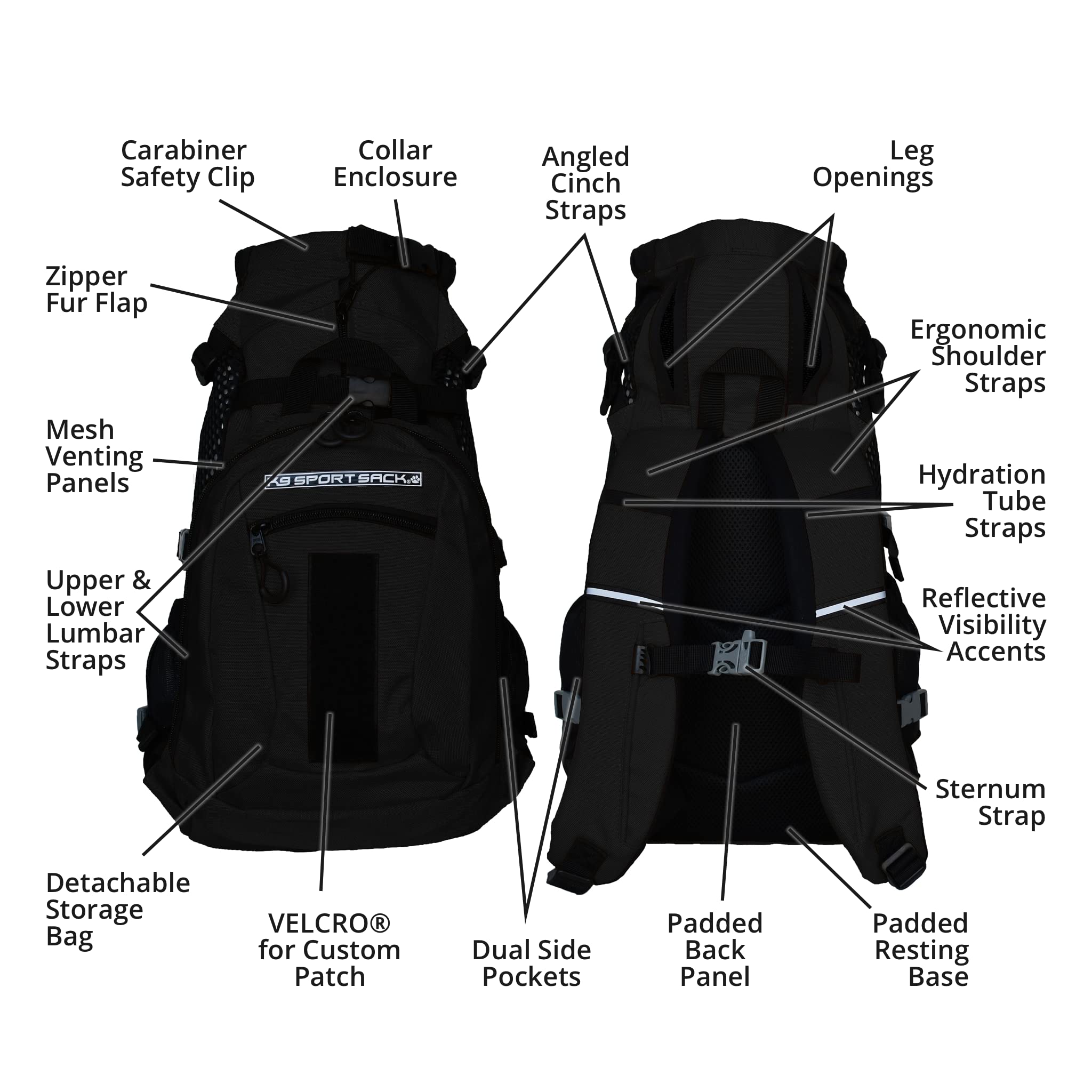 Why own a K9 Sport Sack Dog Carrier? The K9 Sport Sack Dog and pet carrier backpack was created so we never had to leave our dog behind ever again! We want to be able to take our dogs where ever and when ever! K9 Sport Sack was created by dog owners, for dogs and owners - to explore, travel, have fun, and grow closer all while being safe, comfortable and easy. Meet the AIR PLUS. We designed and created the K9 Sport Sack AIR PLUS based off customer feedback from thousands of loyal customers. The AIR PLUS was meticulously developed to be lightweight, have extra storage, ventilation and comfort for you and your dog. We're so excited to bring you the newest AIR model for 2018. The AIR PLUS is an airline friendly pet carrier. It’s super safe for your pup, comfortable for you, built to last, and warrantied to turn heads! K9 Sport Sack AIR PLUS Features: - NEW Detachable storage bag (14"x9") - Fully ventilated sides for maximum air flow - Padded back side for comfort - Re-designed shoulder straps for human comfort - Elastic straps for water bladders or hanging supplies - Strong 20mm thick bottom rest pad to keep your dog comfortable -Safety D-ring for collar hook-up -Adjustable dual side pockets -Upgraded easypull SBS zipper -K9 Whistle Clip on light reflecting sternum strap -Velcro soft side for custom name tags, safety lights etc. -VETERINARIAN APPROVED SIZING: Measure from collar to floor in begging position (see image for dog measuring example) SMALL 14-17 inches: 8-14lbs Medium 17-20 inches: 13-20lbs Large 20-23 inches: 20 up to 30lbs * Weight may vary from dog to dog and are only included here as a supplementary metric to assist in correct sizing. Please measure your dog first and use the weight as a secondary consideration.