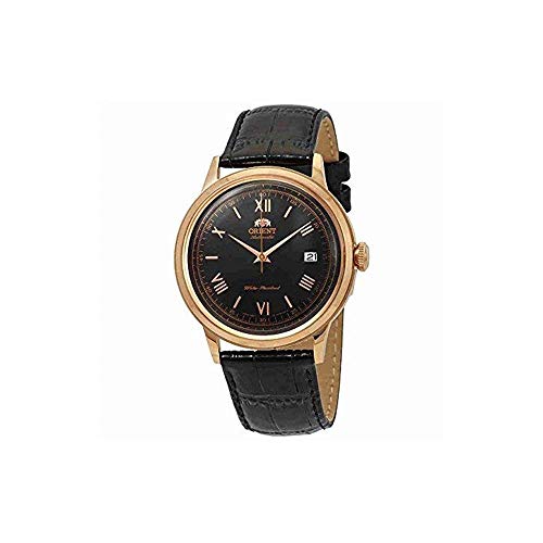 Black dial enhanced by rose gold-tone hands. Rose Gold-tone stainless steel case with a black leather band. Automatic movement. 30 meters / 100 feet water resistance. Fixed bezel. Scratch Resistant Mineral crystal. Solid caseback. Tang clasp. Screw Down crown. Case size 40.5 mm x 12 mm. Band 21 mm x 9 incheslong. Orient FAC00006B0 2nd Generation Bambino Watch.