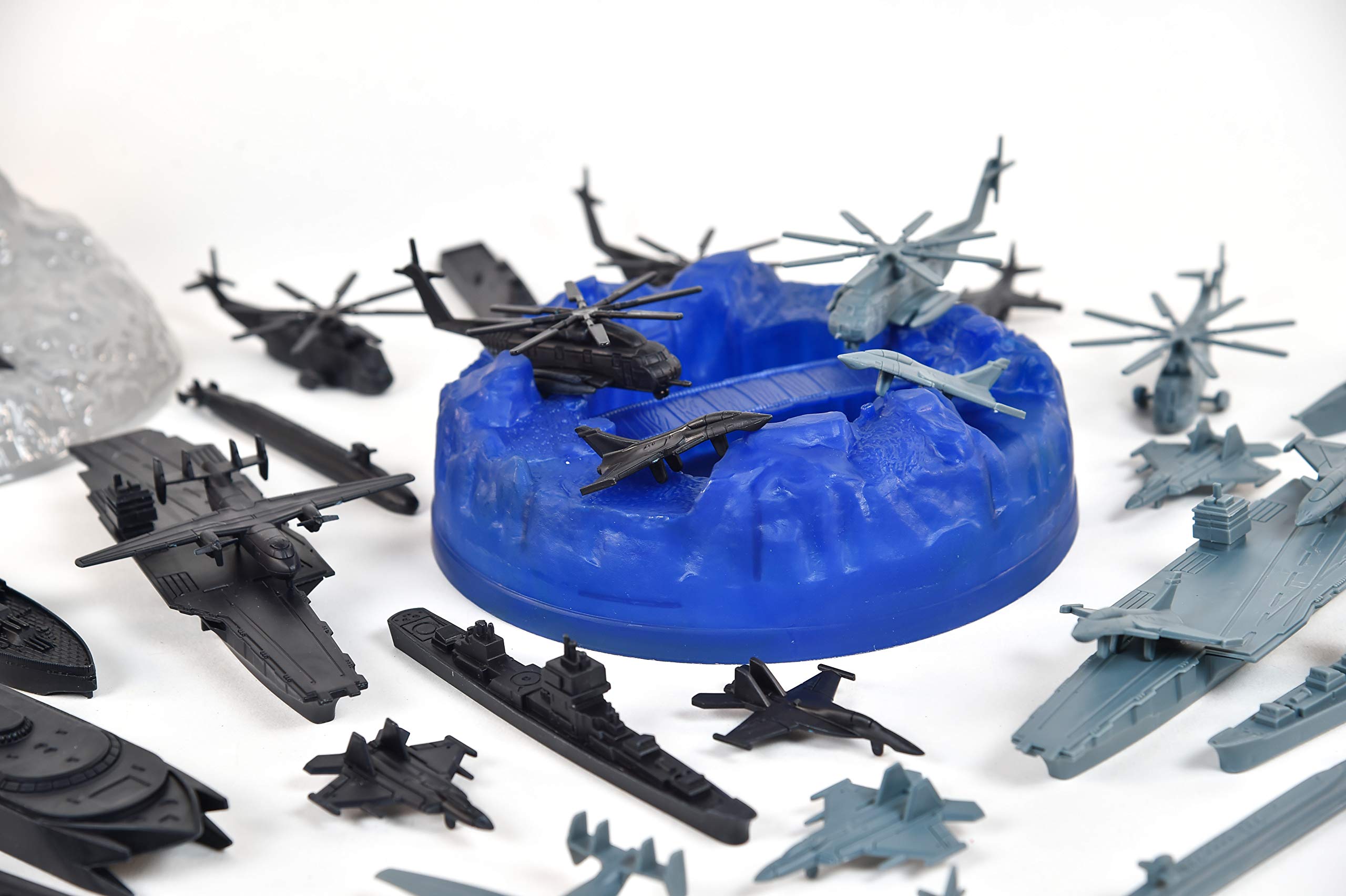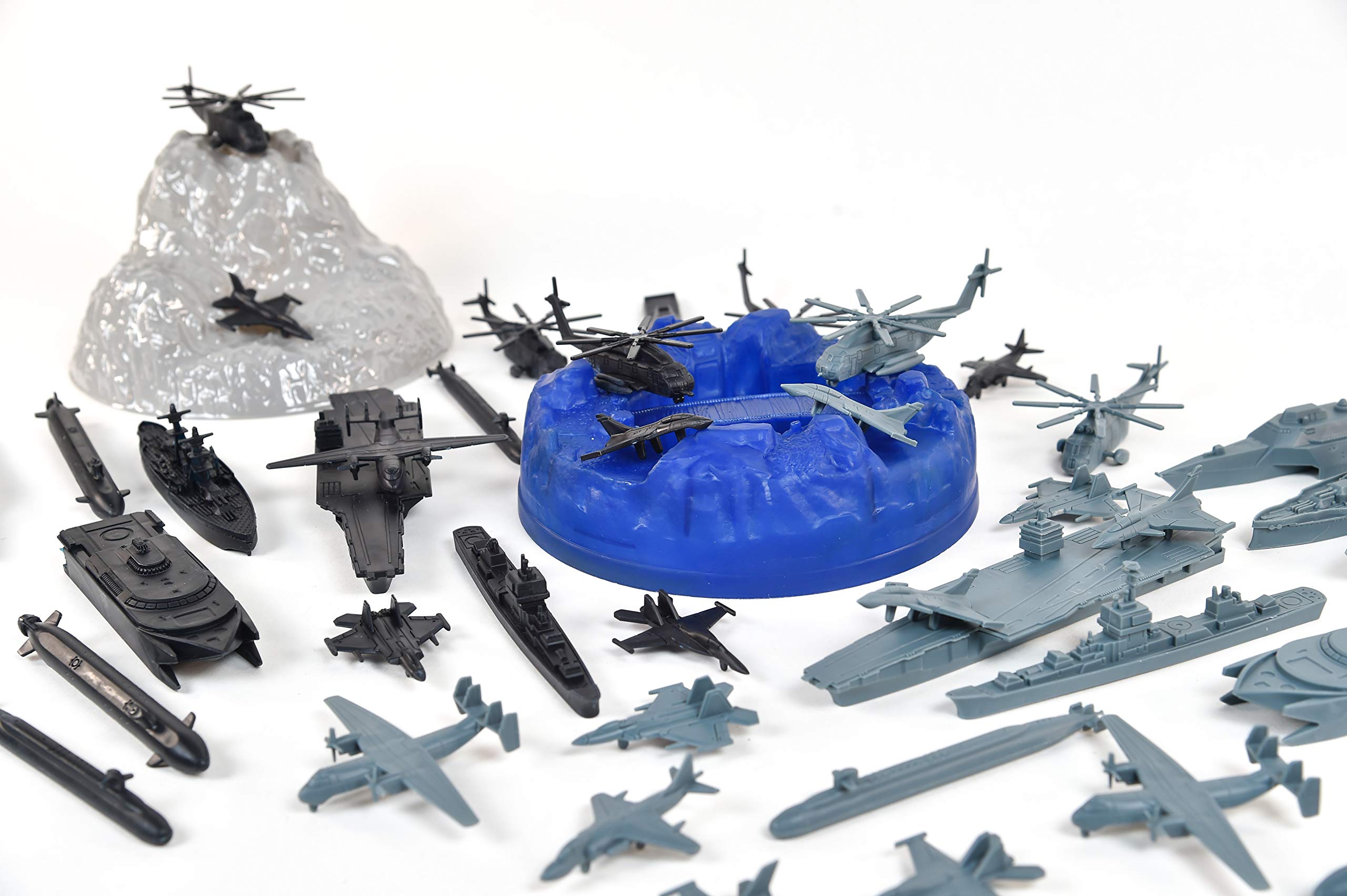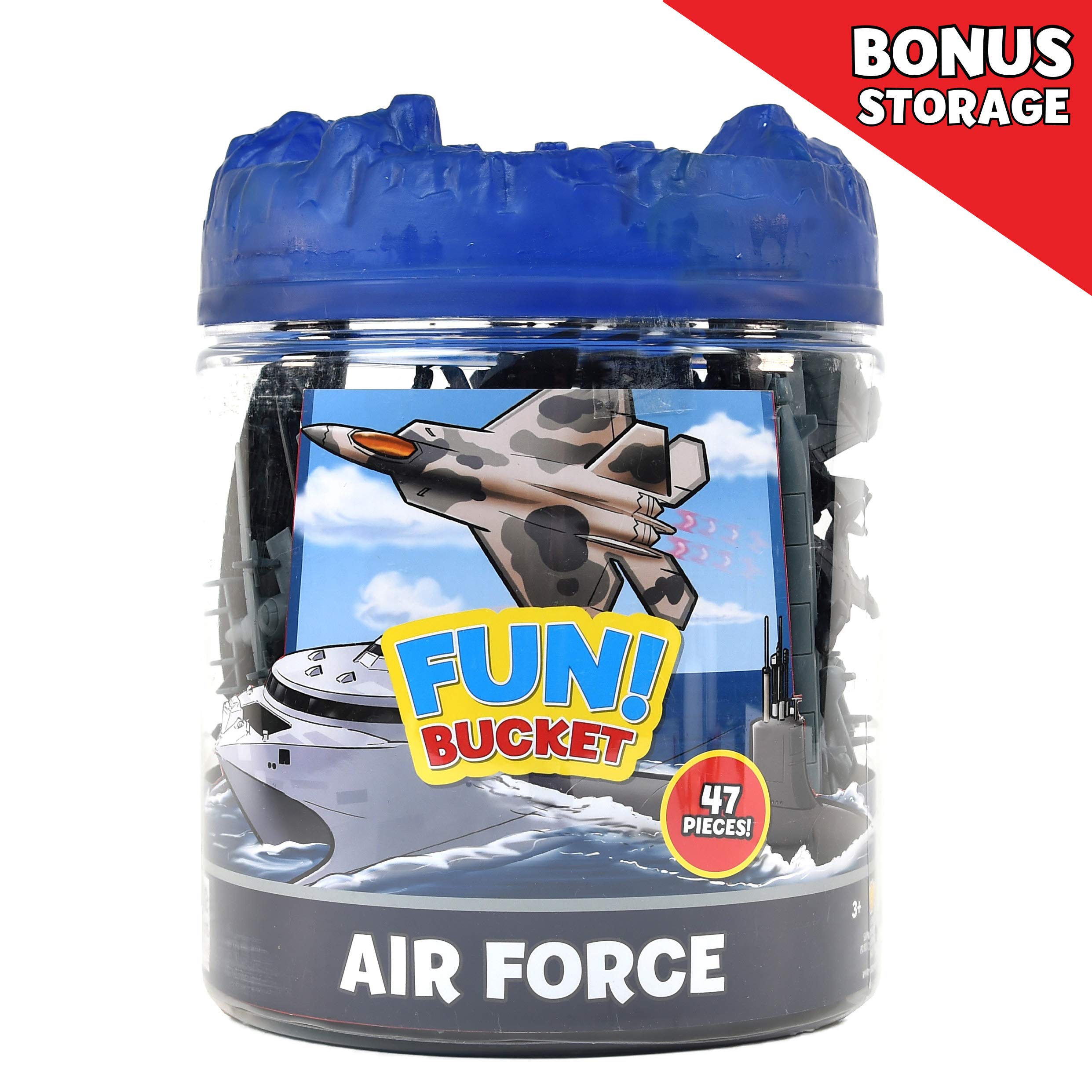 Bucket de la Fuerza Aérea Militar: 47 Battleships y accesorios surtidos de juego de juguete para niños, niños y niñas | Barco de plástico y figuras de avión con contenedor de almacenamiento
