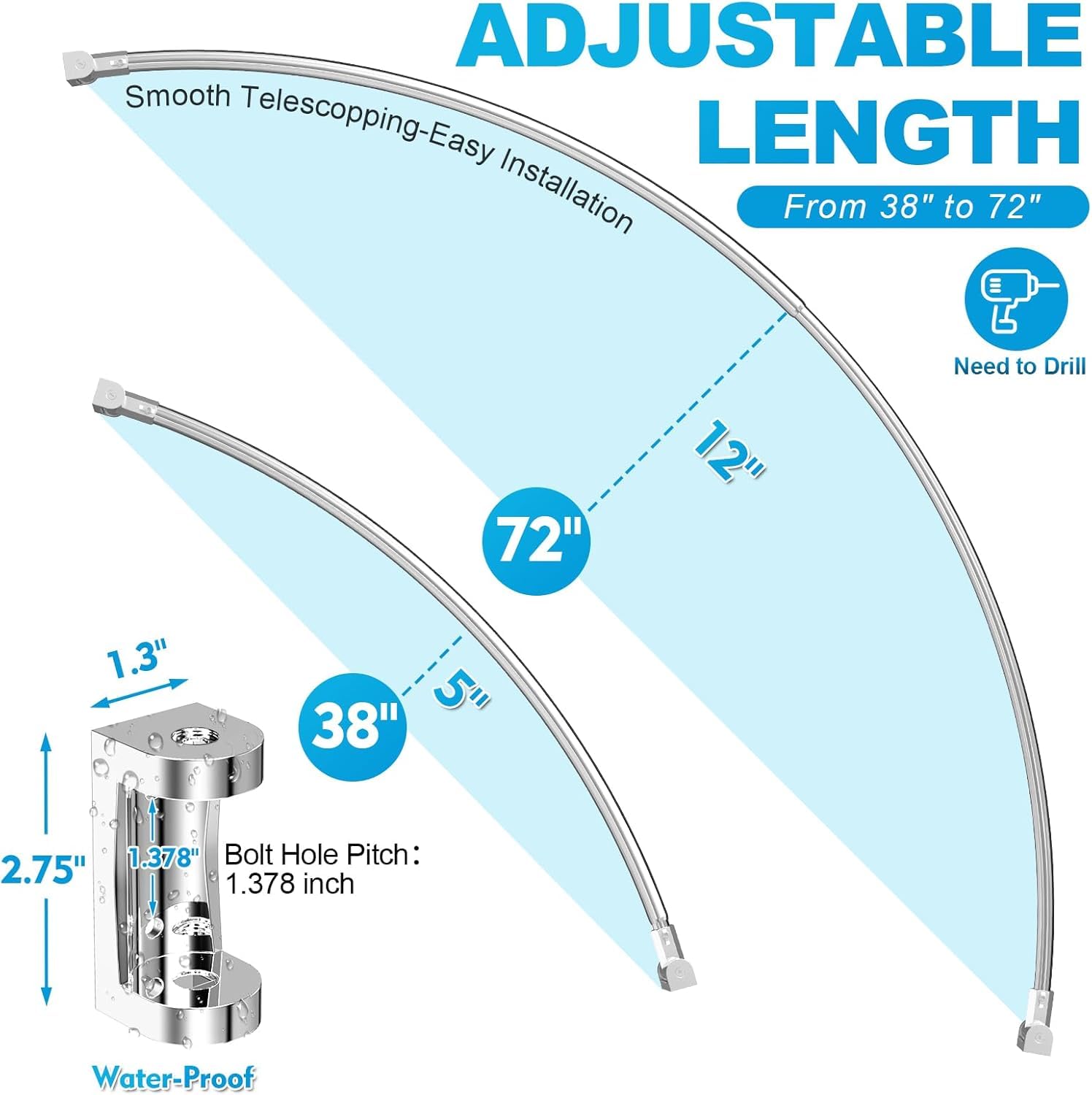 -【Adjustable 38-72 Inches】Adjustable design of this bowed shower curtain rod expand and adjust between 38 and 72 inches to your specific bathroom layout,is the ideal solution for showers in your bathroom.