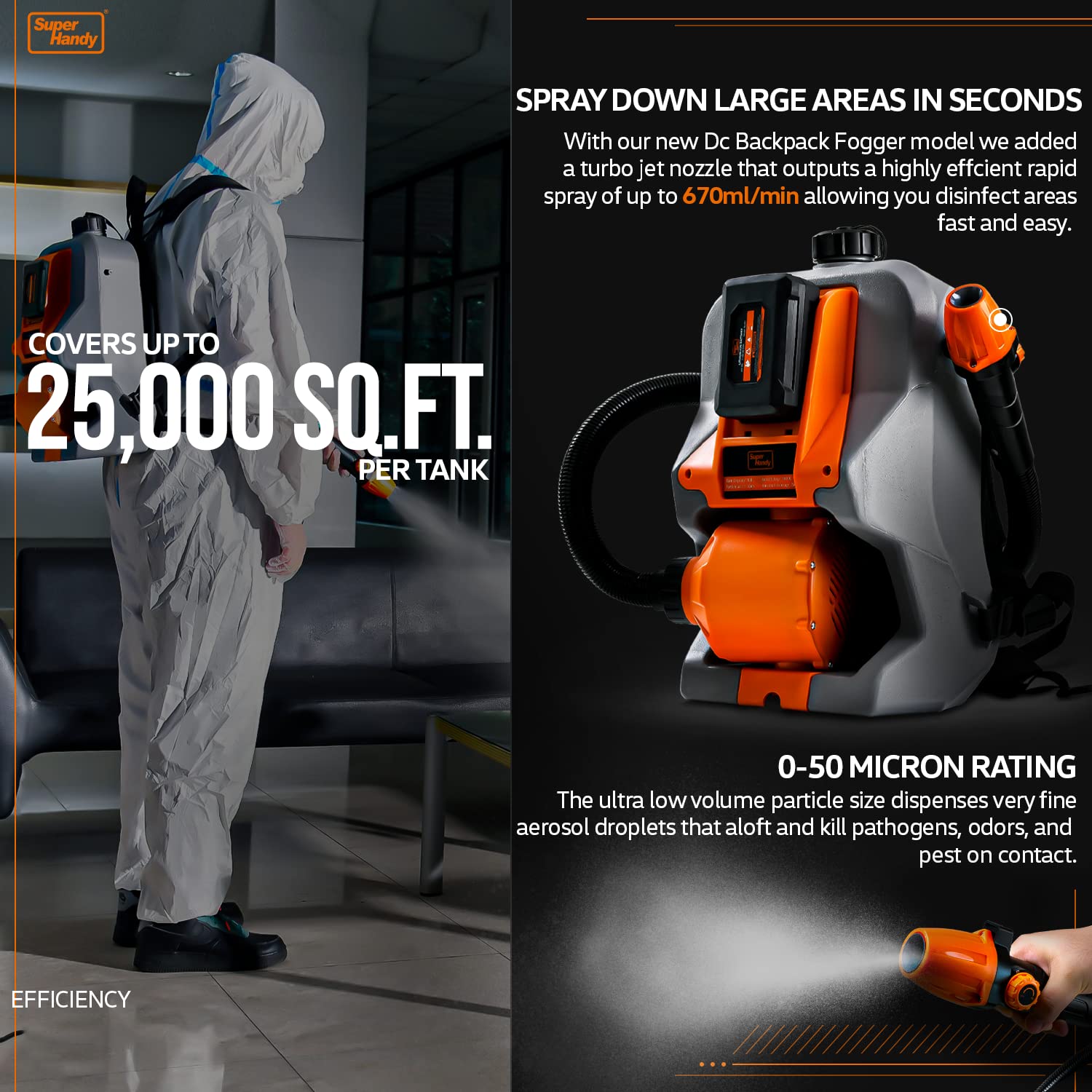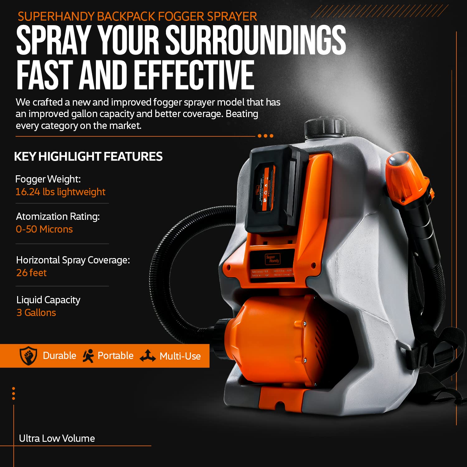 Our SuperHandy Cordless Fogger ULV Sprayer is powered by a 48V DC 350W Li-Ion Driven Electric Motor. Achievable Coverage: Horizontal 20FT+ (5-6m) & Vertical 4.9-6.5FT+ (1.5-2m) of chemicals/liquid for maximum fogging efficiency. Max Fluid Capacity: 2.6GAL/10L. Max Flow Rate of 650ML/min (0.65L/min). Adjustable Output of 1-10GPH & Adjustable Particle Sizes of 0-50μm/Mm (micro-meters/microns), public/animal structures, lawn/gardens, crops/orchards, plants/grow beds in stellar time! Built for high speed aerosol distribution, fast diffusion & strong penetration. Studies show that ULV foggers generate a fog/mist formed of Ultra Low Volume (ULV) droplets of 0-50μm in size & are ideal for fighting pathogens, vector carriers. Equipped w/ a Large Wide Mouth for easy filling & includes a screen filter to keep dirt/debris out of tank. The extended coiled hose allows for perfect ULV misting to keep dust down & humidity up during asbestos abatement. Made to excel in large area spraying but is effective for evaporative cooling of barns/animal rearing/livestock facilities. Use for public sanitation/disinfection of: airports, docks, hotels, restaurants, hospitals, public transport, theaters or for controlling humidity in guitar factories, wine barrel storage rooms, small greenhouses, plant preparation rooms. ULV fogging equipment is used predominately for the application of disinfectanting SAFETY - Always wear hand, eye & breathing protection when operating the ULV Fogger. Keep all electrical connections dry & free of moisture, condensation & water. Keep hands dry before touching on/off power switch. After spraying chemicals, clean the tank with water and use detergent to clean completely. Store in a cool dry place away from sunlight. [DO NOT USE WITH TOXIC OR CORROSIVE CHEMICALS; RECOMMENDED USE WITH WATER BASED CHEMICALS/APPROVED DISINFECTANTS]