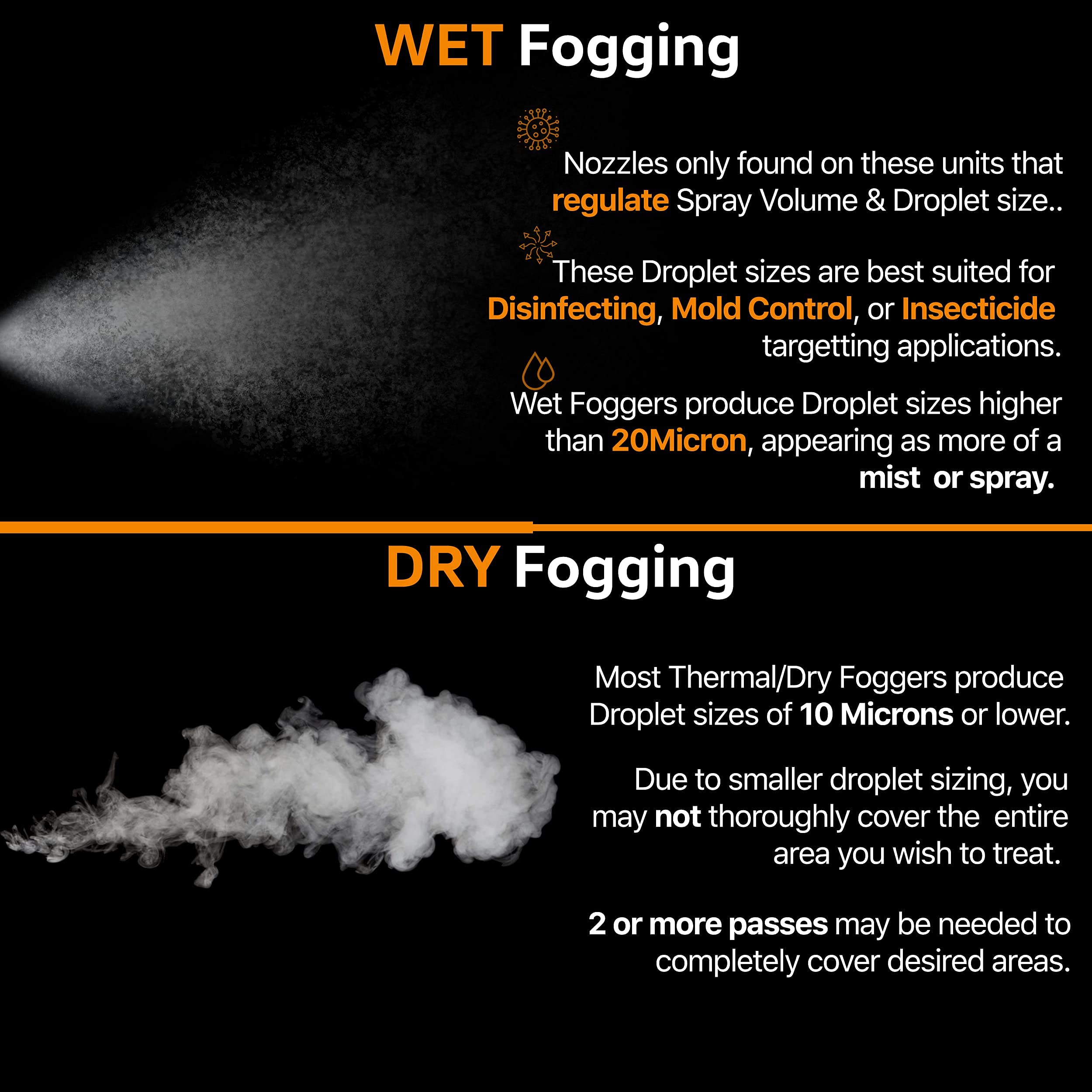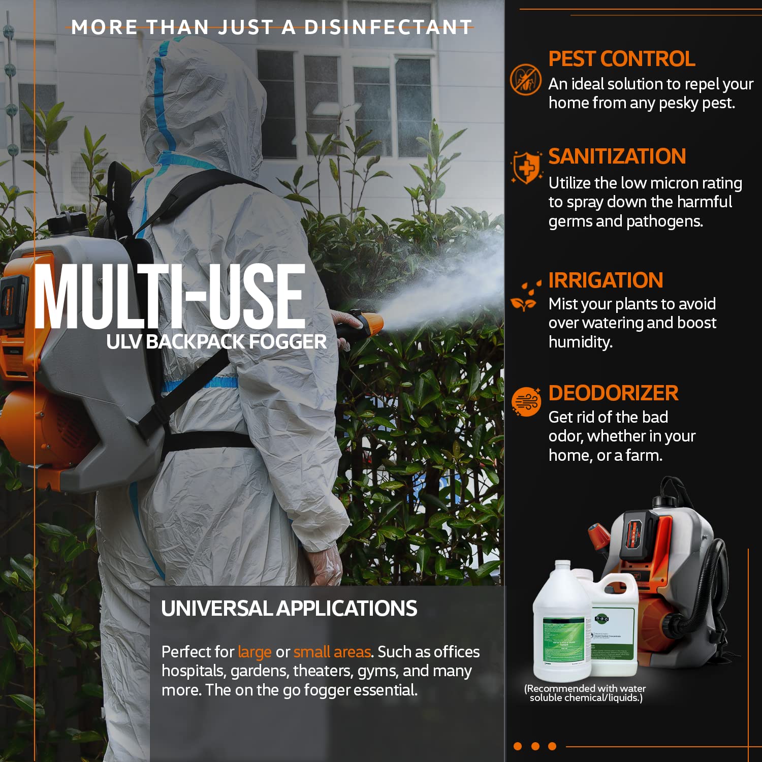 -BEST APPLICATION - Made to excel in large area spraying and is effective for evaporative cooling of barns/animal rearing/livestock facilities; Use for public sanitation/disinfection of: airports, docks, hotels, restaurants, hospitals, public transport, theaters or for controlling humidity in guitar factories, wine barrel storage rooms, small greenhouses, plant preparation rooms; ULV fogging equipment is used predominately for the application of disinfecting