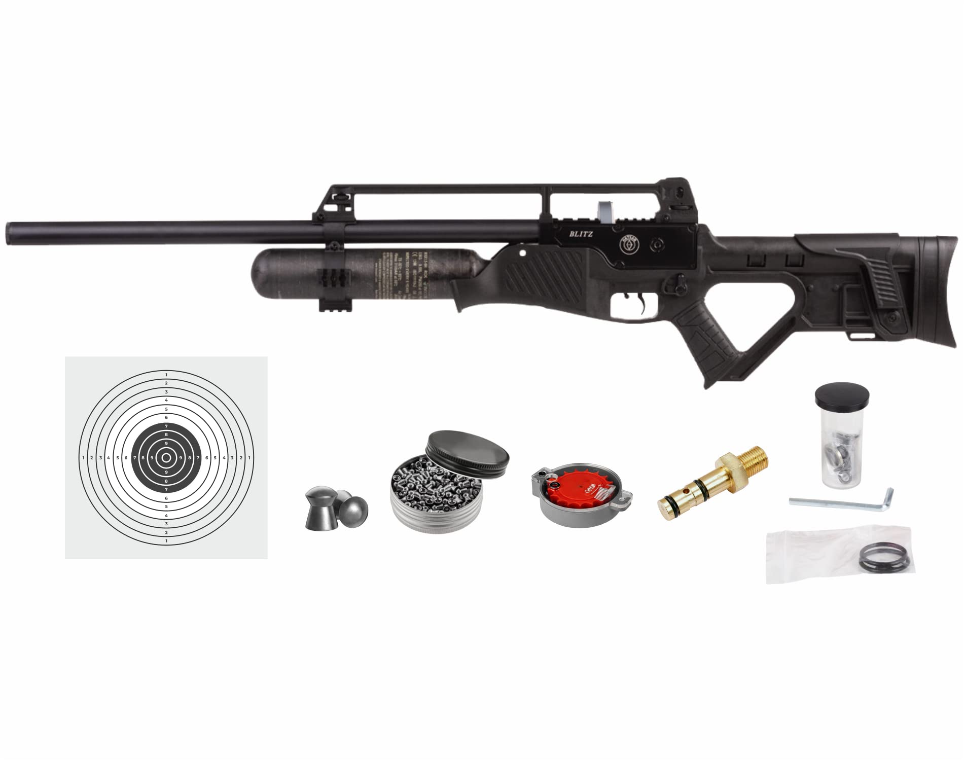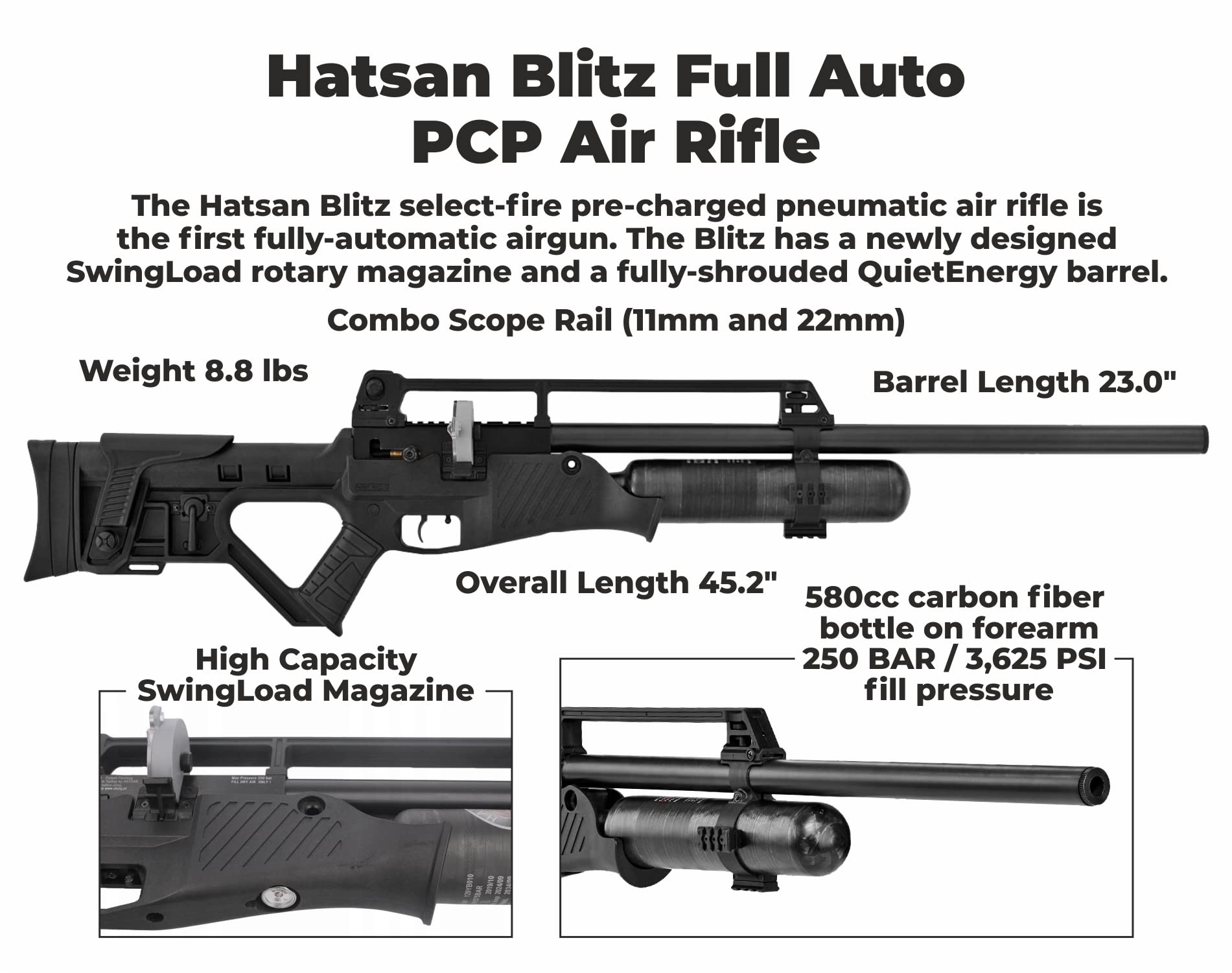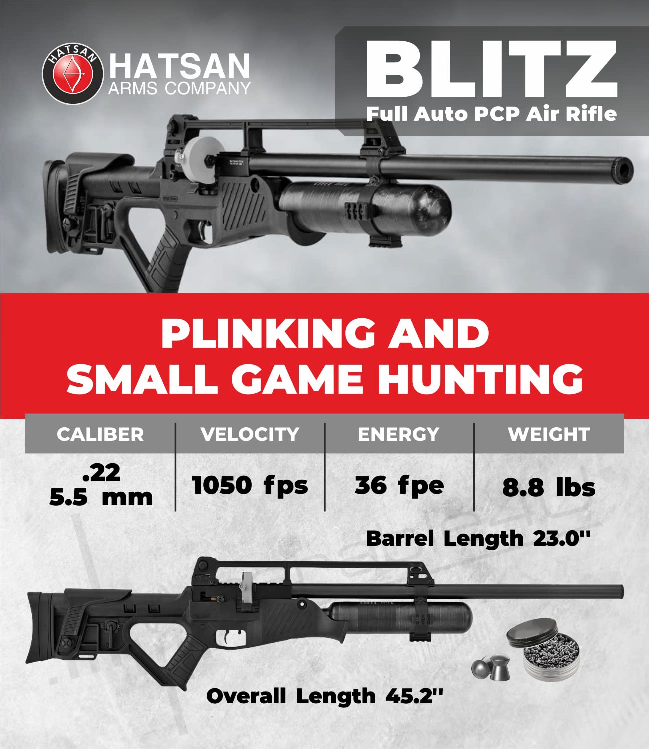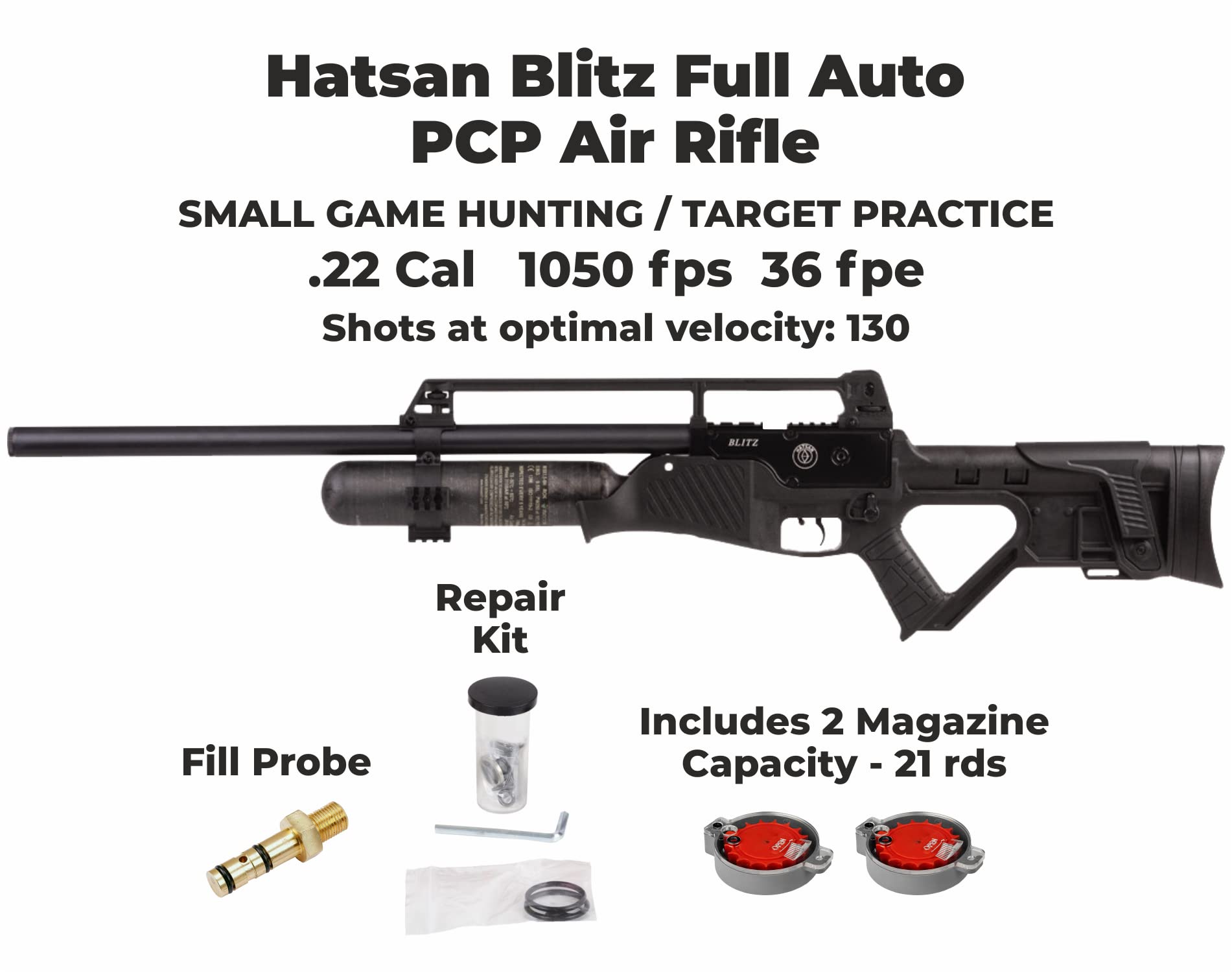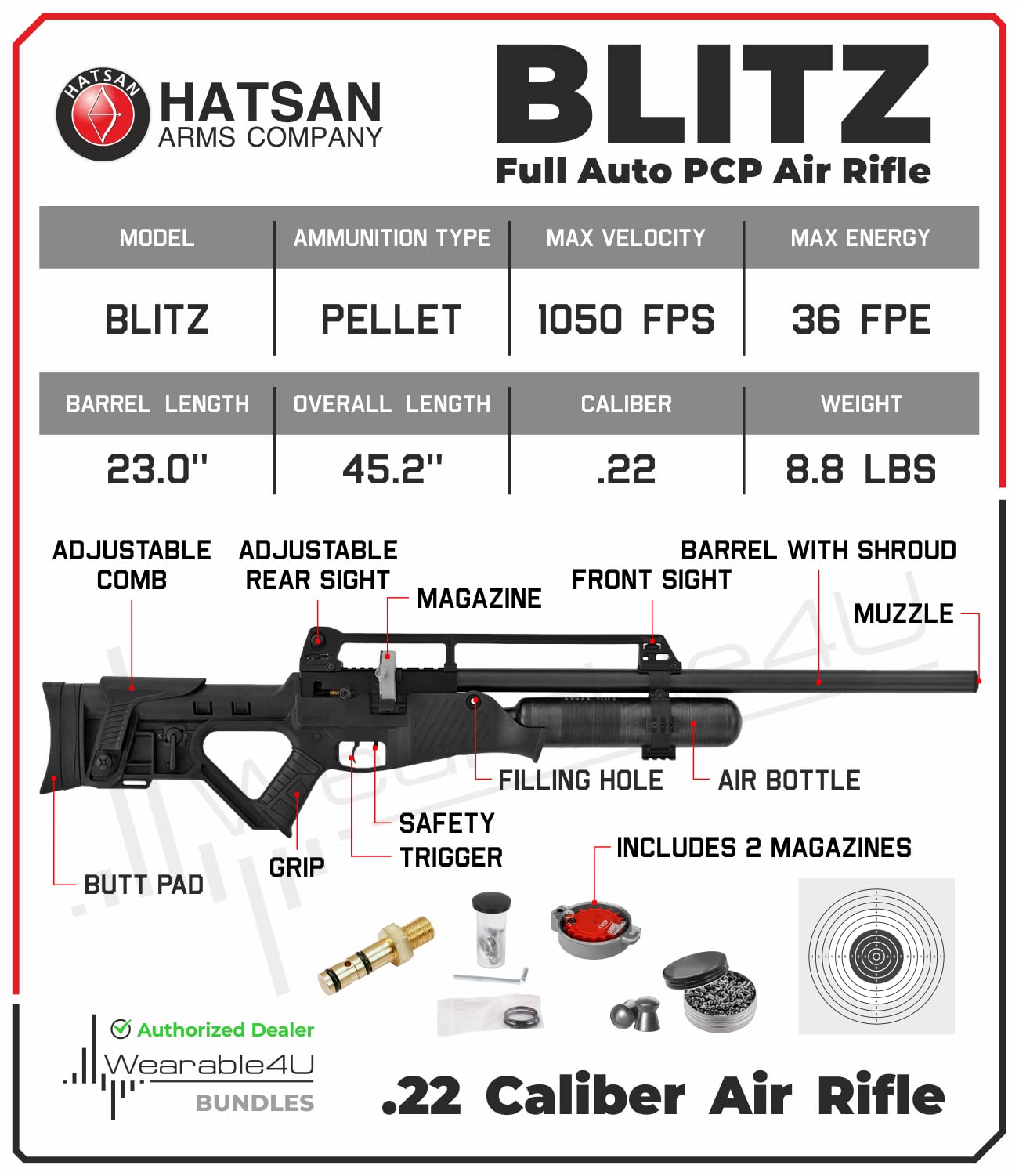 -IN THE BOX: 1 x Hatsan Blitz Full Auto PCP .22 Cal Air Rifle; 1 x Pack of 100x Paper Targets; 1 x Pack of 250x .22 Cal Pellets