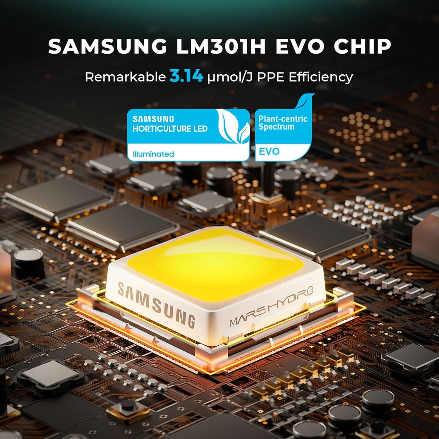 -Supreme Efficiency: The light is equipped with Samsung LM301H EVO LEDs , which are rated at 2298 μmol/m²/s, have a PPE of 3.14 µmol/J per diode, and provides an overall PPE of 2.95 μmol/j. It is a high efficacy and reliability LED package designed for Commercial Planting.