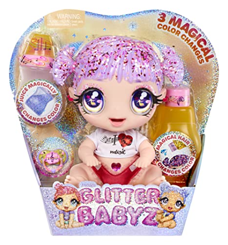 MGA'S Glitter Babyz™ Melody Highnote Baby Doll con 3 cambios de color mágicos, cabello con purpurina lavanda, atuendo musical, pañal, biberón, accesorios para chupete, edades 3 4 5+