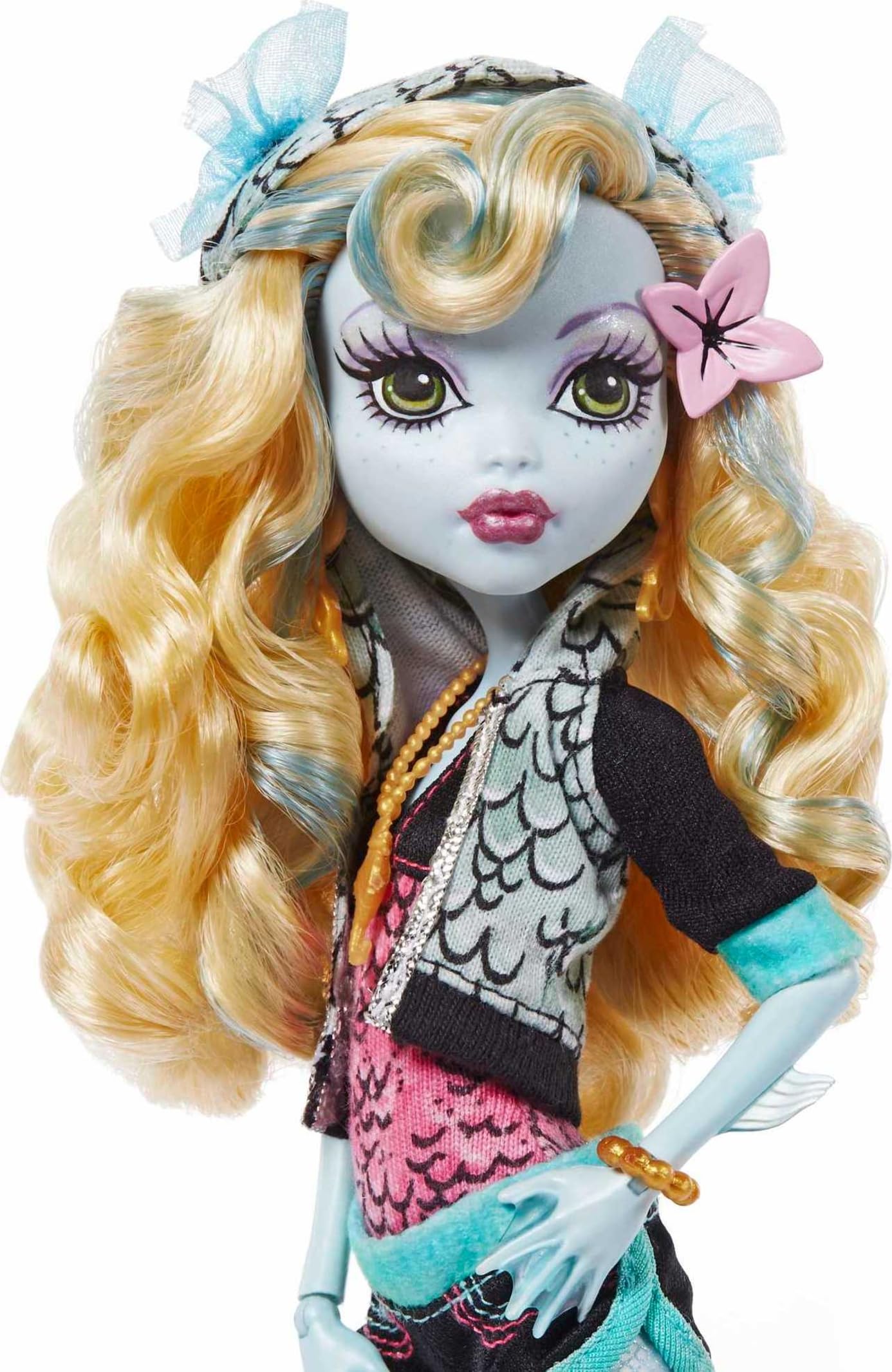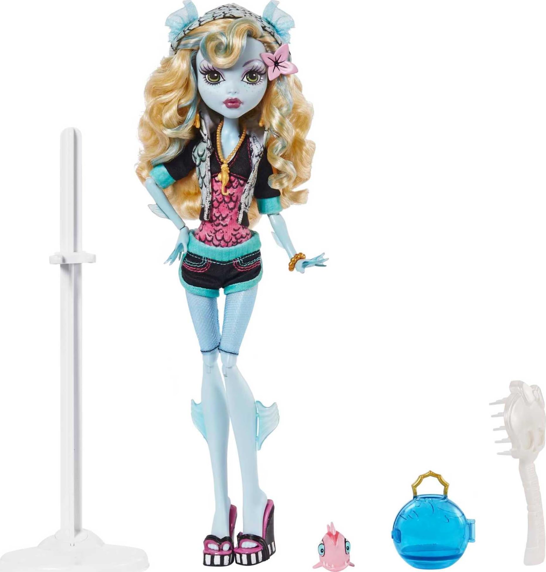 Monster High returns with spooktacular creeproductions of the original ghouls, and they're just as freaky-fabulous as they were on the first day of school! Lagoona Blue doll is totally to-die-for in her signature look, featuring a scaly top, track shorts with fishnet details and a fin-tastic hoodie. Scary-chic sandals and sea-inspired accessories complete her gore-geous look, while her original webbed hands and fins celebrate her unique scaritage. Lagoona Blue doll comes with her pet piranha, Neptuna, plus her Top Eek-ret diary and a hairbrush for scare-tastic styling. With a doll stand and flexibility at the elbows, wrists and knees, fans can capture this collectible Monster High doll in creeperific poses for play or display! Doll cannot stand alone. Colors and decorations may vary.