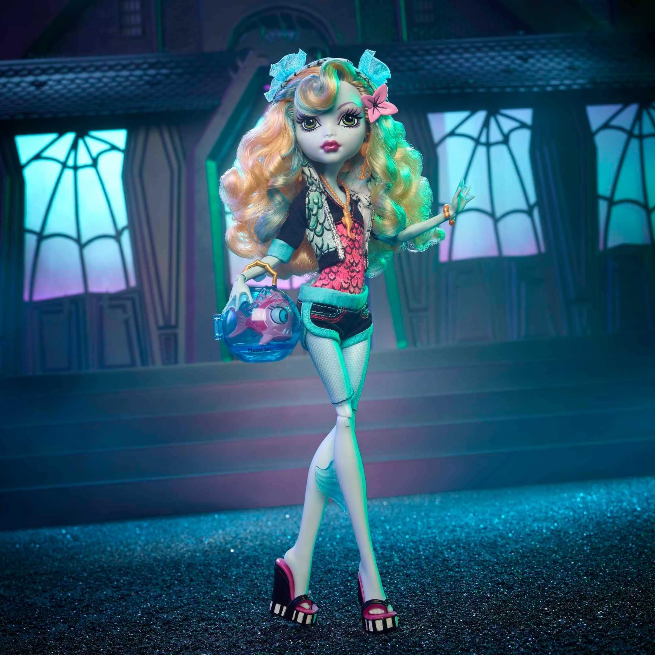 Muñeca de reproducción Monster High Lagoona Blue con moda y zapatos originales con mascota, soporte de exhibición y accesorios, juguete coleccionable de 10-5 pulgadas