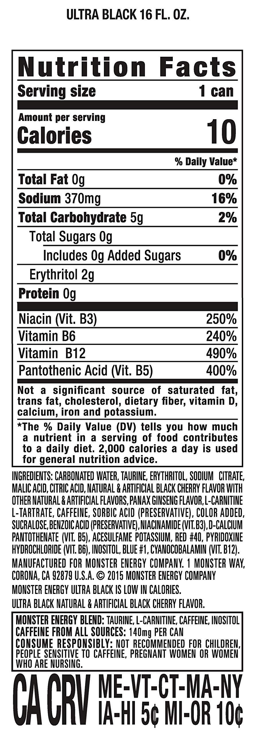-FULL FLAVOR, ZERO SUGAR | Monster Ultra Black has 10 calories and zero sugar, but with all the flavor you’re accustomed to and packed with our sugar-free Monster Energy blend