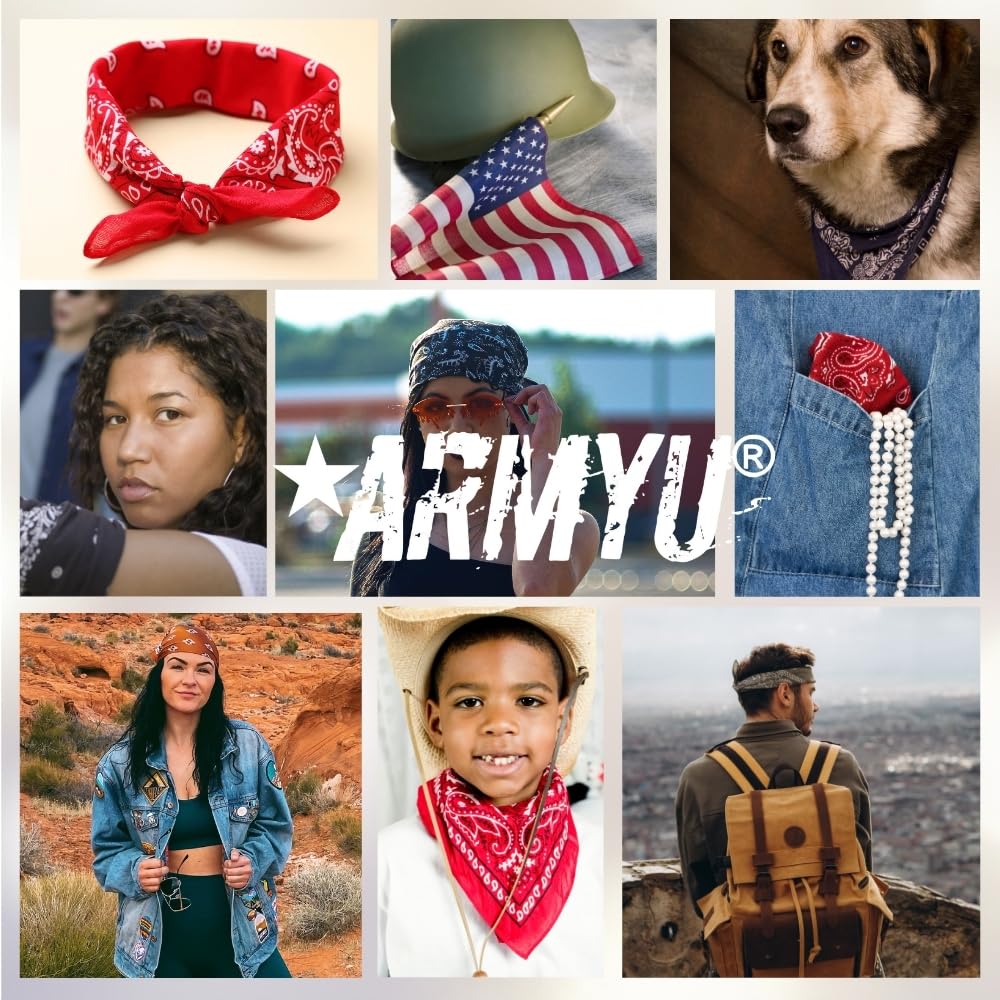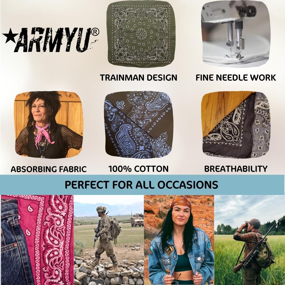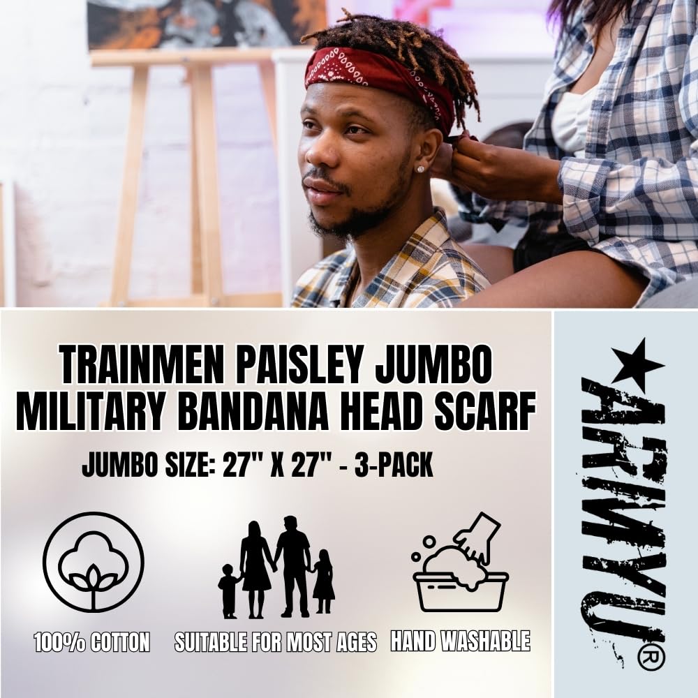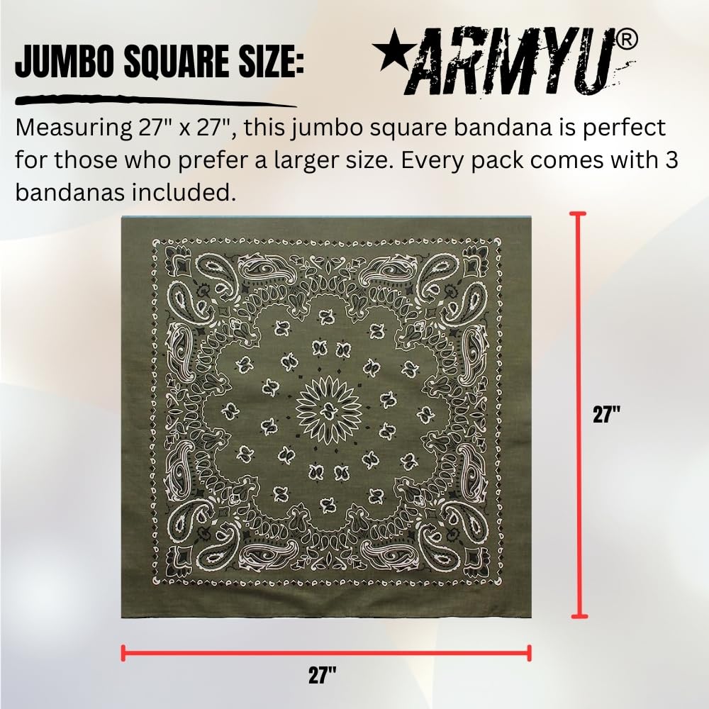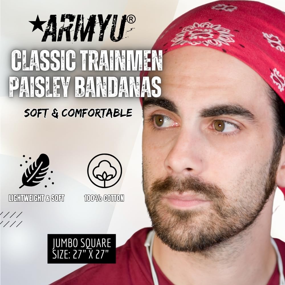ARMYU 3-Pack Trainmen Paisley Jumbo Military Bandana Head Scarf Do-rag 100% Cotton Bandanna Face Cover 27" - These jumbo bananas size allows you to easily fold and tie these biker headwraps however you like. This will surely fit over your head and will definitely cover your face and neck. You can wear them as a bandana, headwrap, doo rag style or face wrap. Use it to clean, or carry it around in your car as a rag. You will love the classic paisley print on these bandannas and each print is stamped and clear. These bandanas can be utilized in many ways, every single day by almost anyone. Whether you are looking to block the sun on a hot day, or a bandana face wrap for a dog, you can tie these in so many ways. Essential items for almost any camping, hunting enthusiast and a absolute must have. Bandanas are made from 100% cotton which are subject to shrinking. Do not machine wash. Hand wash. Colors may run slightly when washing from the dye of the material. Material will hold colors for a long time if washed carefully and properly.