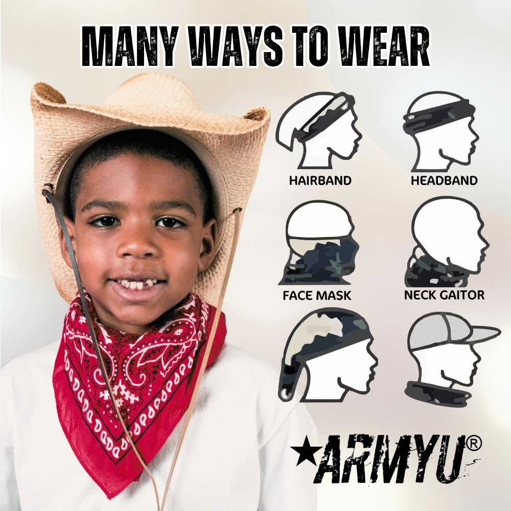 -3 PACK: Every pack comes with 3 bandanas included. These are perfect for all occasions like parties, camps, bbqs, get togethers, napkins, table accessory. Makes a great for handkerchief, headband, wristband, head cover, dust mask, while painting or doing crafts, exercise, doo rag, cute accessory for your dog or baby, great for kids to dress as a cowboy.