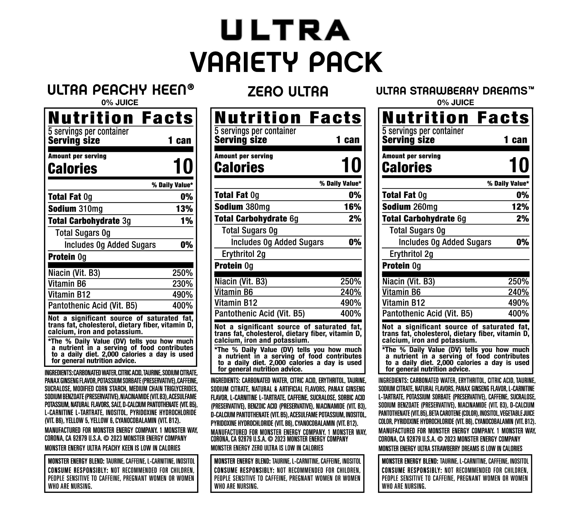 This variety pack offers three different options for a unique selection of flavors! The light, refreshing citrus flavor of Zero Ultra has broken the rules of flavor. 10 Calories, zero sugar, and a full load of our Monster Energy blend to keep the good times rolling. Zero Sugar Ultra Peachy Keen has just 10 calories and a full load of our Monster Energy blend. The juicy peach flavor will send you back to the sumer of love. Take just one sip and you'll be crazy for Ultra Strawberry Dreams. Wonderfully sweet, while slightly tart, this easy-drinking Ultra tastes like a dream. Packed with the Monster Energy blend you love, with just 10 calories and zero sugar.