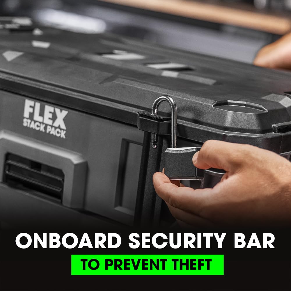 Keep your trailer, garage, or workshop organized with the FLEX STACK PACK™ 2-Drawer Tool Box. This two-drawer toolbox features auto-locking mechanisms that securely close and prevent drawers from opening during transport while durable rust-resistant rails ensure the drawers open and close smoothly over a long life. The oversize lower drawer is ideal for larger tools like circular saws and the toolbox comes with removable dividers so you can organize a variety of hardware or supplies. Quick-connect latches offer fast and effortless connectivity so you can quickly stack and unstack toolboxes for a fully customized STACK PACK™ configuration. An onboard security bar allows you to lock the drawers to prevent theft and stows between use. It’s protected by a one-year limited warranty when registered within 30 days of purchase at registermyflex.com.