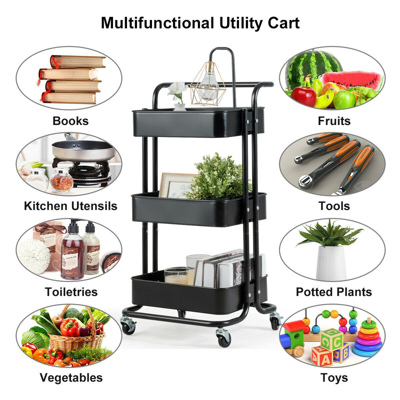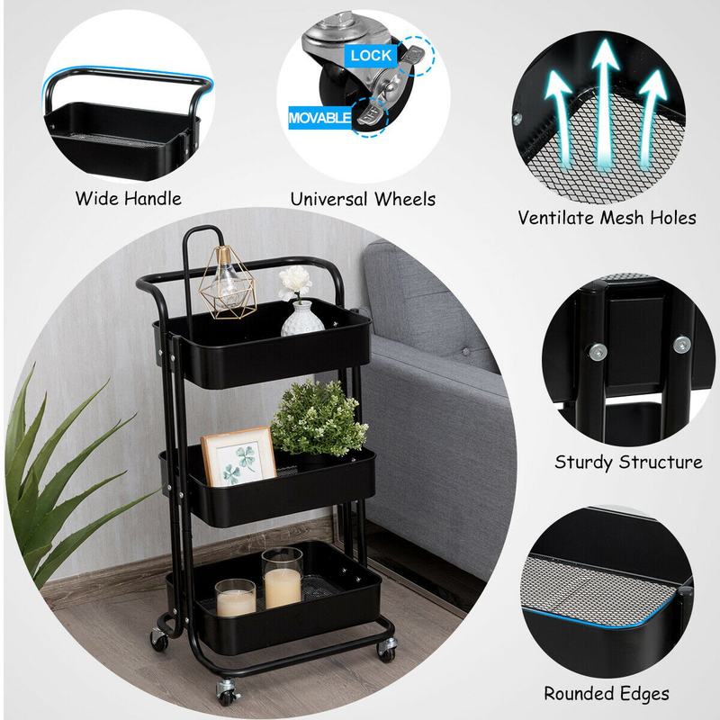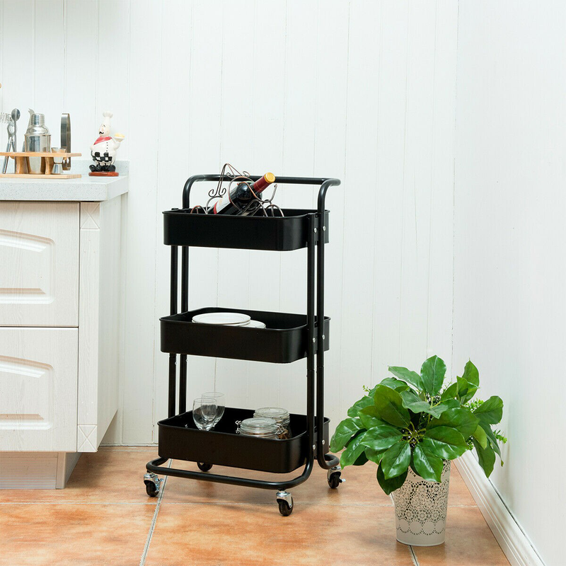 Made of powder coated steel, this trolley cart is sturdy and durable, able to withstand long-term use. Featuring four universal wheels, it can be easily moved anywhere you need. 3-tier design provides large storage space while saving you floor space to optimize the space utilization as much as possible. Simple appearance makes it suitable for living room, kitchen, dining room and other occasions.