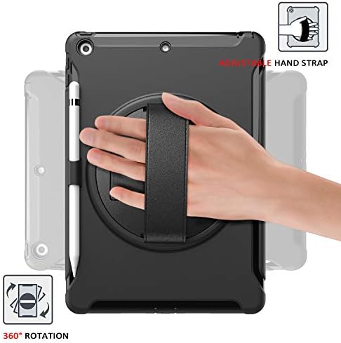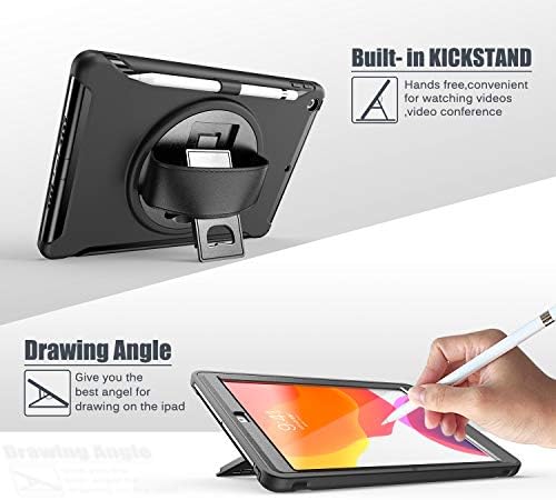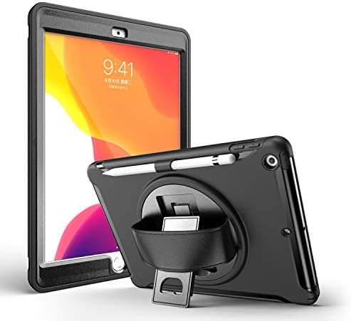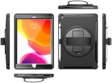 Color:Black Compatibility:Apple New iPad 7th Generation 10.2 inch (2019 Release), Model Number: A2197, A2198, A2200. This caseDOESNTcontain a screen protector. Features: 1. 3 in 1 design rugged tablet case provides all round protection to keep the iPad safe and secure. 2. Using this 360-degree rotating kickstand allow you to set up multiple angles,which can provide a more comfortable and convenient way to use and free your hands for other entertainment. 3. An adjustable hand strap provide a convenient way for you to hold the tablet without using both of your hand. Can adjust the tightness of the strap according to the size of your hand. 4. Raised Cutouts Design, ensures extra protection of screen and camera, also can protect your iPad from dropping, scratching. Package included 1 X Fashion Case for iPad 7th Generation 10.2 inch. Note: the color as show in the picture may be a little different from the actual item because of color setting and lighting.