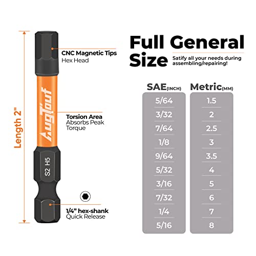Augtouf Juego de brocas de llave Allen de cabeza hexagonal de impacto, 20 piezas (métricas y SAE), juego de brocas hexagonales de acero S2 de vástago hexagonal de 1/4", puntas mecanizadas CNC con magnetismo, 2" de largo con caja de almacenamiento