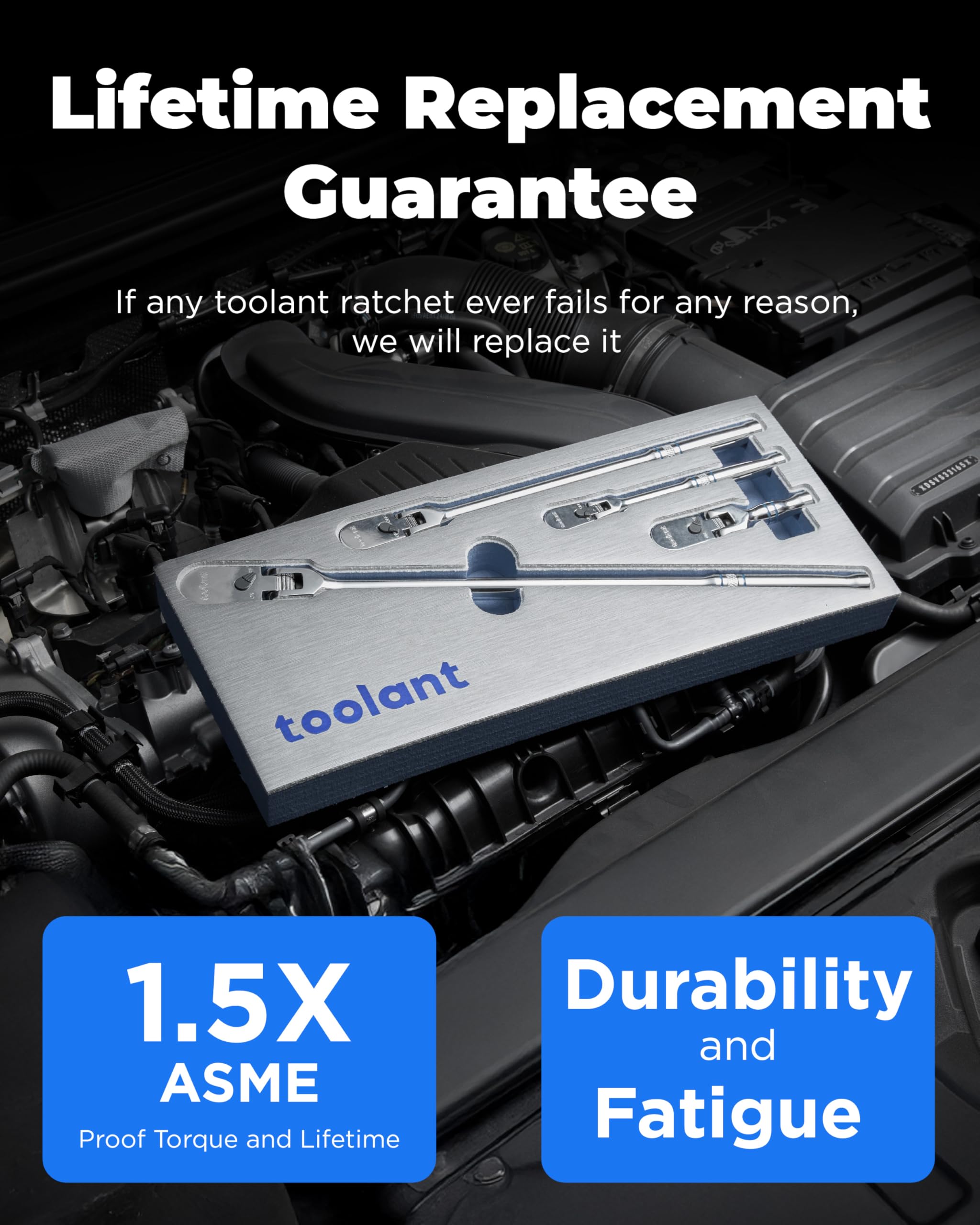 -1.5X ASME Proof Torque and Durability: toolant flex head ratchet wrench set is engineered for tight spaces without sacrificing strength. toolant compact-head ratchet delivers 1.5x the torque and durability of ASME standard with durability against stripping and corrosion. Standard ASME is 50,000 times Service life, toolant is up to 75,000 times and more