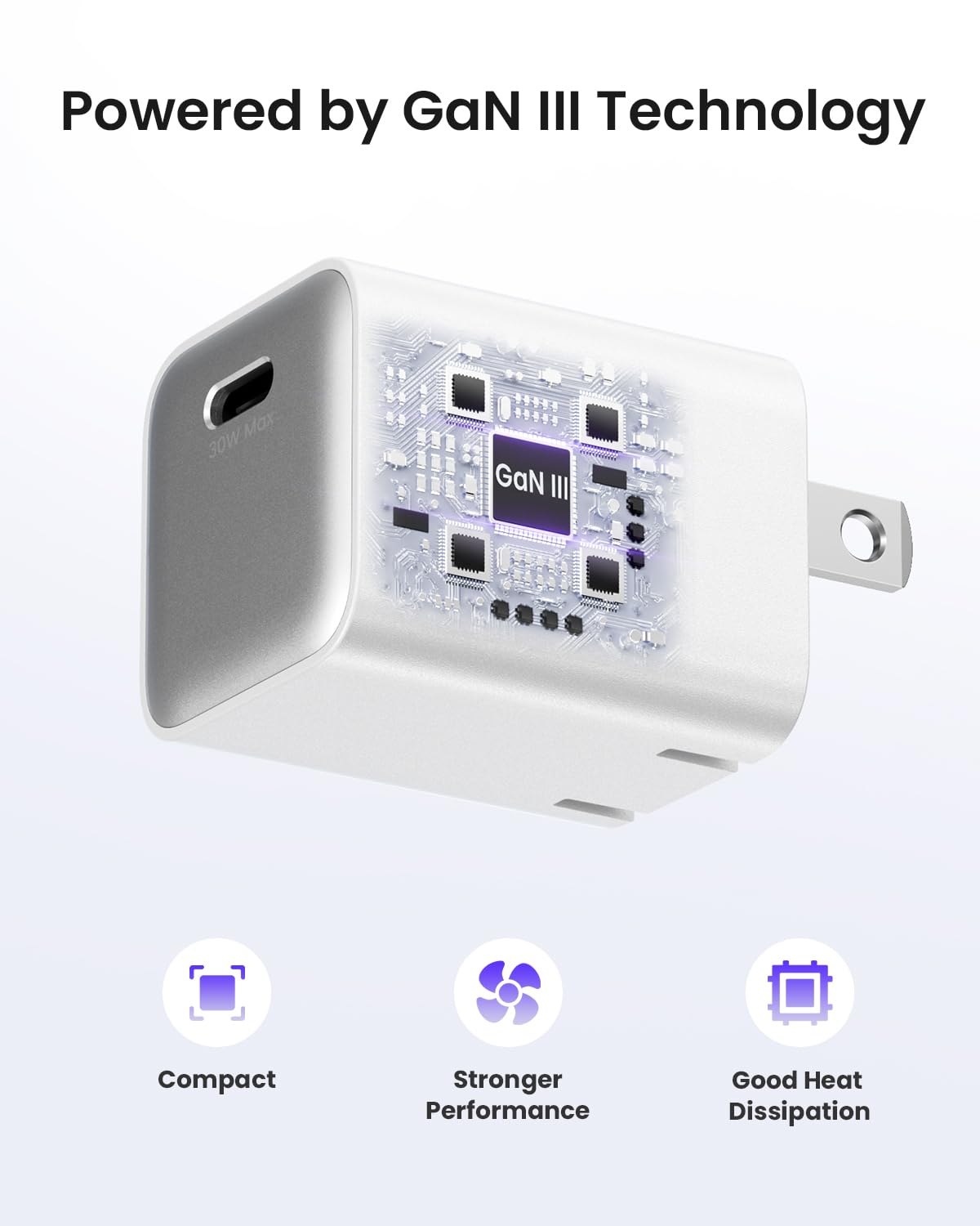 wegear Bloque de Cargador USB C de 30 W, Cargador de Pared Compacto con tecnología GaN III, Cargador rápido Plegable PD3.0 PPS QC4.0 para iPhone 16 15, Galaxy, Pixel, iPad, AirPods, MacBook Air