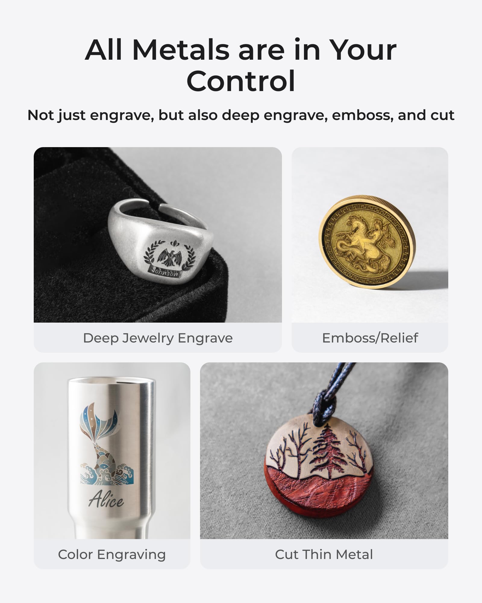 -3D Embossing and Deep Engraving: With 20W power in both fiber and diode lasers, the F1 Ultra laser engraving machine handles intricate, multi-level 3D engraving and deep engraving on various materials, including metal, wood, and rock, creating high-value items.