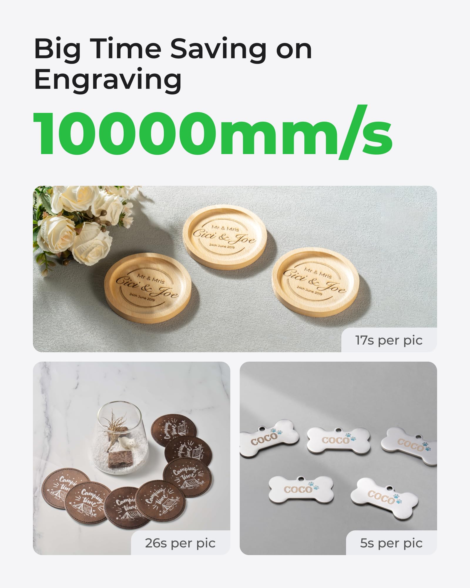 -Support almost all materials Ultra-Fast: Introducing the world's first 20W fiber and diode dual lasers, achieving speeds up to 10,000mm/s. The fiber laser can engrave all metals (gold, silver, copper, stainless steel, brass, titanium, etc.) in seconds, while the diode laser excels on wood, acrylic, leather, glass, rubber, fabric, and more.