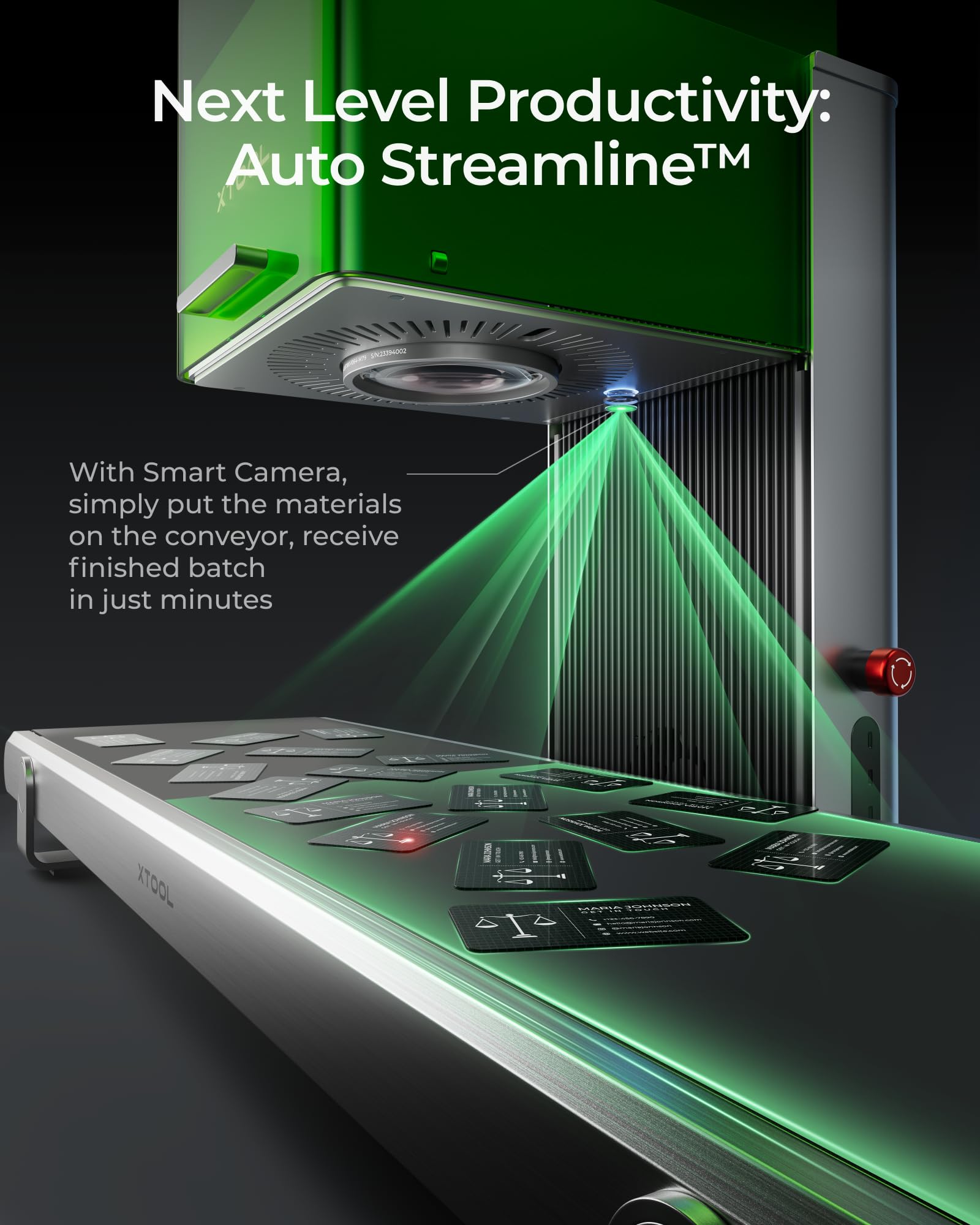 -Factory-Level Productivity: xTool's exclusive Auto Streamline Production, powered by the Auto Conveyor and a 16MP SMART CAMERA system, effortlessly manages batch engraving. This laser engraver and cutter machine automatically recognizes shapes on the conveyor, intelligently fills patterns on every piece nonstop, and with its 10,000mm/s speed, completes entire batches in minutes.